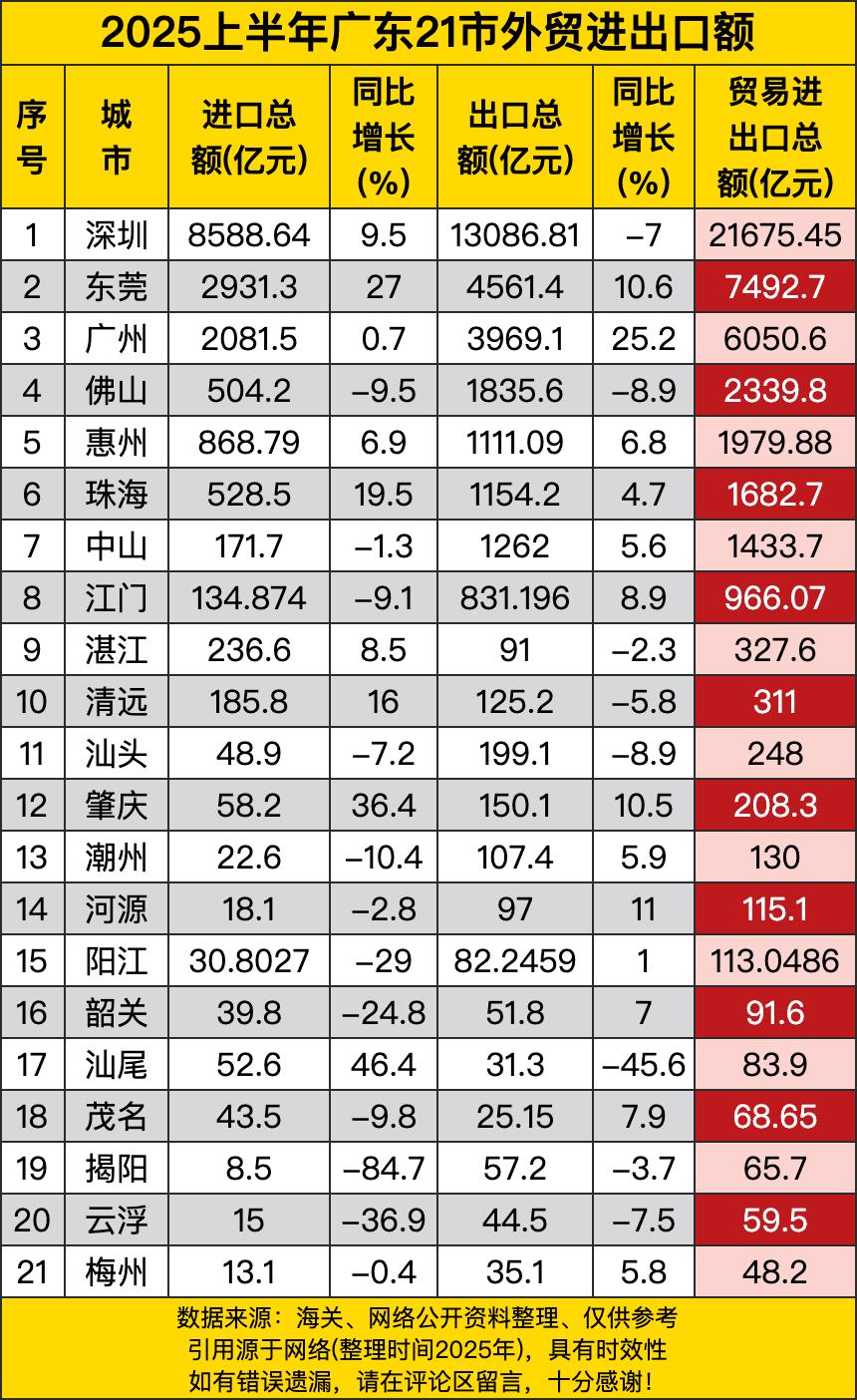 看看2025年上半年广东这21市的外贸进出口数据,那可真是有人欢喜有人愁啊!深圳大哥还是稳坐第一把交椅,进出口总额高达21675.45亿元,进口涨了9.5%,就是出口稍微掉了点链子,降了7%。不过这也正常,毕竟树大招风,保持领先不容易呐。 再瞧瞧东莞,这匹黑马杀得挺猛!进口增长27%,出口增长10.6%,进出口总额7492.7亿元,直接冲到第二。就像班里原本不起眼的学生,突然考试逆袭,让人刮目相看。看来东莞这外贸功夫是越来越到家了。 有些城市就没那么幸运咯。佛山、中山这些老牌选手,进出口居然都下滑了。佛山进口降9.5%,出口降8.9%,中山进口降1.3%。就像跑步的时候突然崴了脚,速度就提不起来了。也不知道是市场竞争太激烈,还是自己没跟上节奏。 更惨的是揭阳和云浮这些城市,进出口总额本来就不高,还在大幅下降。揭阳进口狂降84.7%,云浮也降了36.9%。这就好比在赛道上被越拉越远,得赶紧找找问题,加把劲追赶了,不然差距只会越来越大呀!