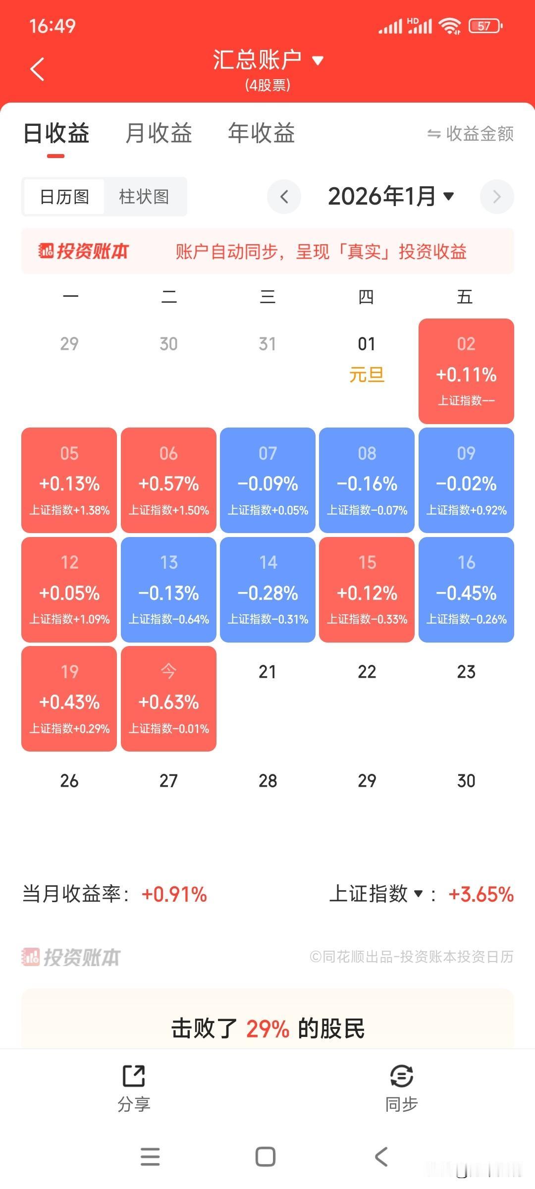 今天风格转换了?题材股下跌,老登股上涨。其实股市就这样,涨多了跌一跌,跌多了涨一涨,才会让股民痴迷于这种套利的游戏之中。 持仓的蓝筹红利价值股止跌反弹,这个位置再跌一跌更好,反正我又不卖,还不如多跌一点,多拿点便宜筹码。 今天账户上涨0.63%,本月收益0.91%。 现在同花顺投资账本显示账户自动同步,呈现真实投资收益,为这个点赞!