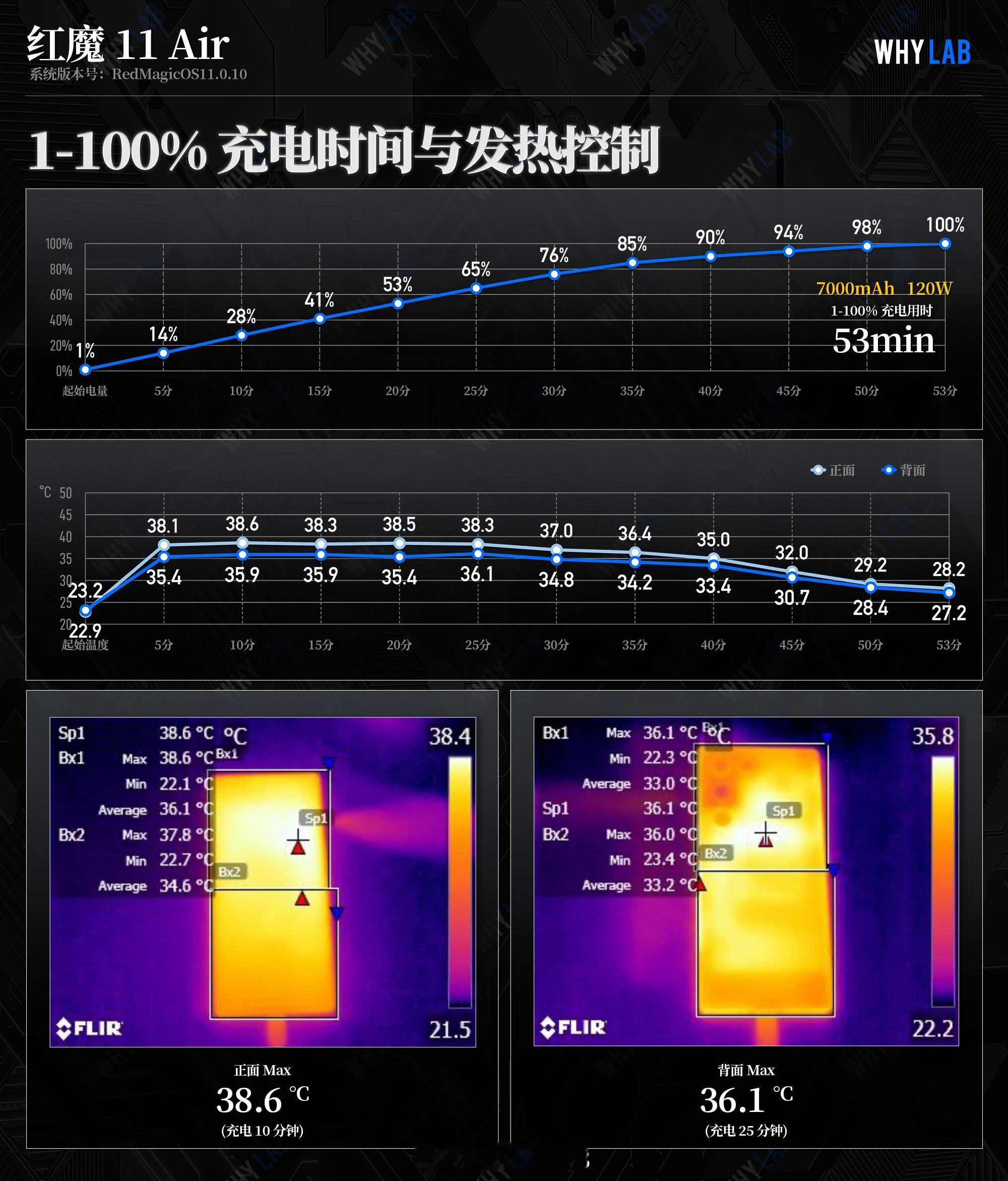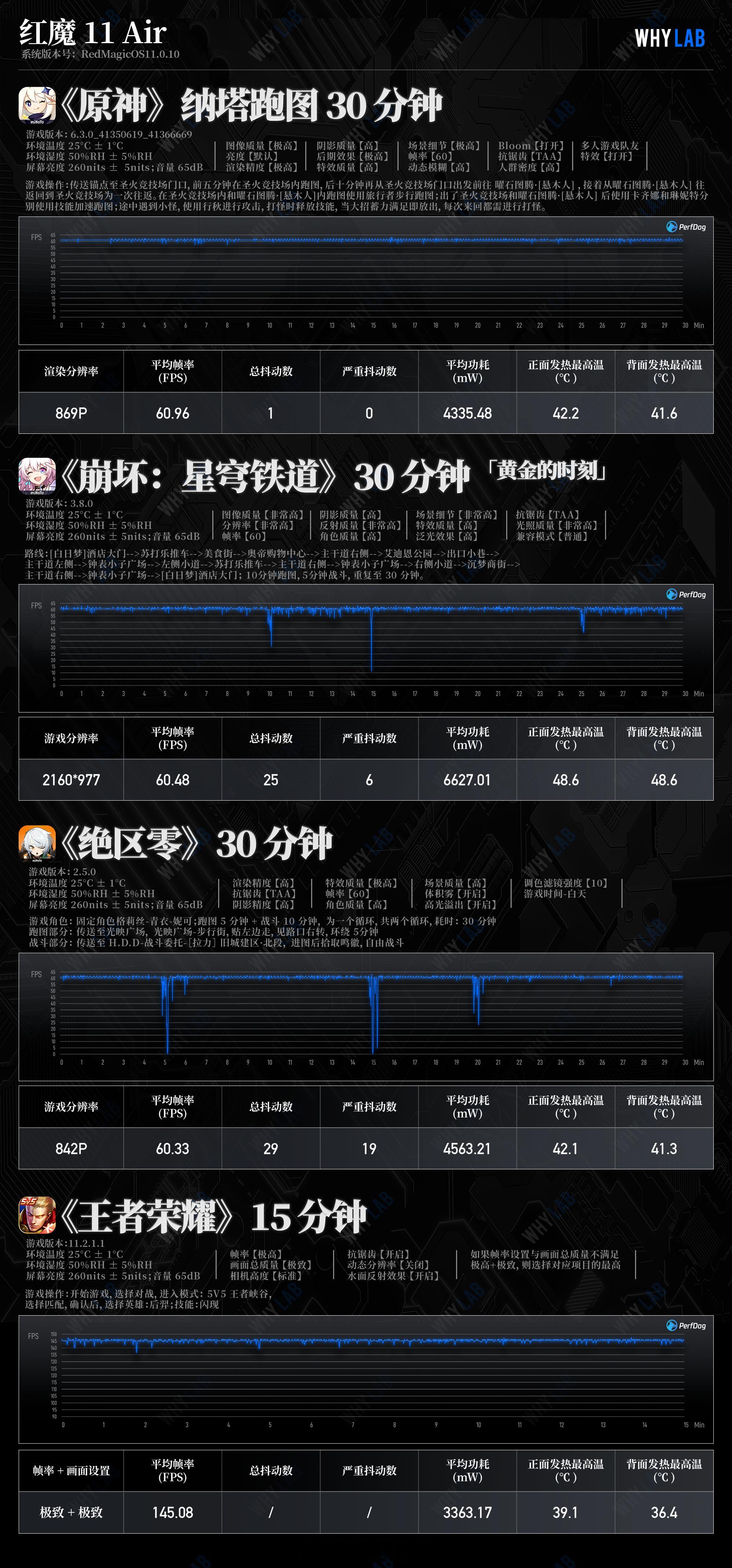 WHYLAB数据库 新增红魔 11 Air 测试数据,红魔 11 Air 的相机数据以及更多新机的测试数据可以访问小程序「WHYLAB」,进行查看。➢ 🎮 游戏:作为全球首款内置风扇的 Air 机型,红魔 11 Air 的硬件选型自然也不虚,上一代旗舰芯片骁龙 8 至尊版 + 9600Mbps LPDDR5X 内存 + UFS 4.1 闪存,当友商类似配置都在 2500 价位徘徊时,红魔何以定价 2999 元?首先就是性能上的调校,非常出色,说是性能表现最出色的骁龙 8 Elite 也不为过。轻负载的《王者荣耀》中,得益于升级了一块 144Hz 屏幕,红魔 Air 系列也成功解锁了王者 144fps 模式,15 分钟一局对战,帧率全程是一条直线,平均帧率 145.08fps,功耗发热极低,仅有 3362.17mW 和背面 36.4℃;《原神》纳塔 869P 30 分钟,帧率依旧拉满,平均 60.96fps,平均功耗 4335.48mW,背面也只是微微发热的 41.6℃;高负载的《绝区零》842P 30 分钟,不删除转场掉帧,平均帧率 60.33fps,严重抖动 19 次,平均功耗 4.5W,背面最高 41.3℃,表现好的不像骁龙 8 至尊版,游戏调校确实有种红色魔力;继续上压力,测试《崩坏·星穹铁道》黄金的时刻 2160×977 渲染分辨率,平均帧率也做到了满帧,平均 60.48fps,功耗控制优秀 6627.01mW,背面温度最高处在出风口附近,为 48.6℃。小小总结下,如果你想买台轻薄的游戏专用机,选红魔 11 Air 准没错,可以应付绝大多数高负载场景,甚至有和骁龙 8 Elite Gen 5 机型一战之力;➢ 📱 屏幕:采用了一块 6.85 英寸 2688×1216 的京东方 Q10 OLED 真全面屏,看选型,应该是和努比亚 Z70 Ultra 是同一块屏幕,实测手动最高亮度达到 636.15nit,全局激发亮度 1402.9nit,亮度均匀度差点意思,只有 92.18%,手机右上角偏暗。默认鲜艳模式下,屏幕的色温为 7147K,偏冷;在色准方面,鲜艳模式下 P3 124 色平均 DeltaE 为 2.62、如果追求显色精准,建议选择标准模式,P3 124 色平均 DeltaE 为 1.81,希望能在迭代机型里看到红魔能调优;➢ 🔋 续航:相比上代电池增加 1000mAh,配备一块 7000mAh 牛魔王电池,在模拟一般用户日常一天使用的五小时续航中,剩余 63% 电量,成绩和 iQOO 15、荣耀 Magic8 Pro 相当;继续用剩余电量循环大型游戏到关机,续航归零成绩为 7 小时 47 分,介于努比亚 Z80 Ultra 和 iQOO 15 之间,与常规形态直板机有差距,但确实续航表现最好的 Air 机型之一了;➢ ⚡️ 充电:搭配 120W 快充,从 1% 开始,10 分钟即可充电 28%,完全充满用时 53 分钟,充电期间,背面最高温度 36.1℃,我们认为红魔充电时温度策略太过保守,可以稍微放开一些温控,缩短充电时间。以上就是红魔 11 Air 的实验室测试数据,2999 元的价格随比友商同配置机型定价稍贵,但提供的游戏和性能体验是领先的,如果对游戏和手机的便携有比较极致的追求,那么红魔 11 Air 会是不错的选择。