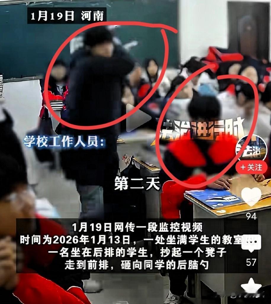 河南,文人高校出恶霸,行凶后被劝退,出的通告惹争议。 近日,河南一所高中教室内发生一起恶性伤人案,一名黑衣学生用凳子把把一名同班同学打了,被打者经医院检查无大碍,打人学生被劝退,视频中现实打人者抡起凳子的架势用了劲头可不小,被打者不可能没有一点外伤吧?打人学生劝退就是没受一点处罚是一样的,被打者也没有追究刑事责任,这说明什么?,