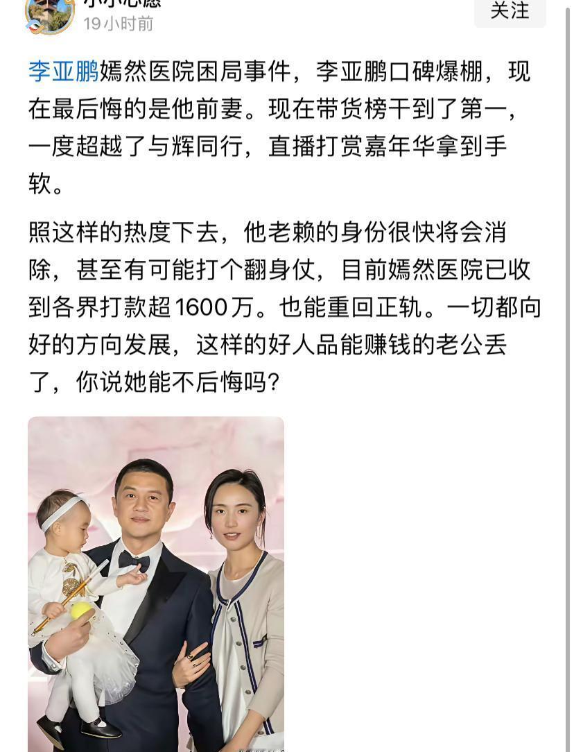 李亚鹏前妻直播喊话复婚? 他刚靠真诚视频狂揽2000万捐款! 网友刷屏:再生个儿子吧! 海哈金喜却笑着回应:感谢大家支持他。 这哪是复婚劝说 分明是成年人的体面告别 他6天涨粉百万 她单场带货300万 离婚后各自在顶峰相见 最新视频里他说 “人生没有回头路” 但转身就筹备新文化项目 有人猜离婚是为保护财产 可你看这两人 一个在商海沉浮 一个在直播间发光 谁都没被过去拖住脚步 最讽刺的是 当初骂他“渣男”的网友 现在排队给他捐款 而当初被嘲“高攀”的她 早已活成自己的女王 所以啊 成年人最好的状态 不是破镜重圆 而是各自精彩 还能笑着为对方鼓掌 你更佩服谁的转身? 评论区聊聊