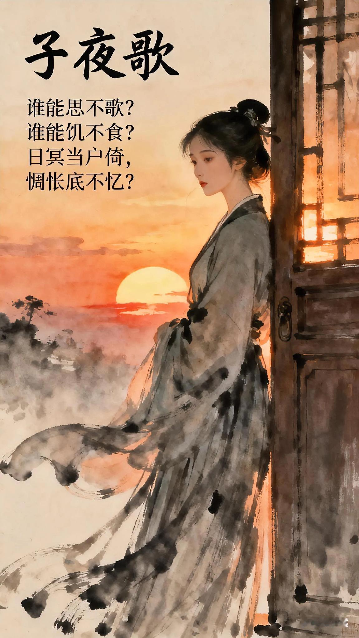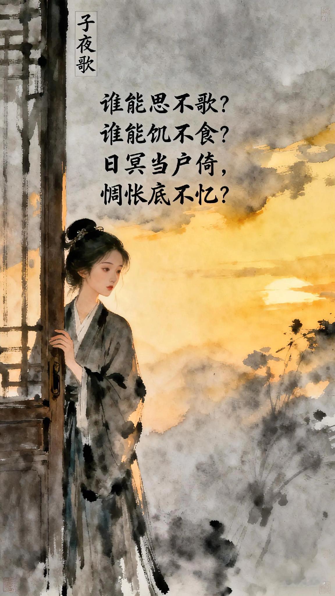 《子夜歌》宋、作者不详。 谁能思不歌? 谁能饥不食? 日冥当户倚, 惆怅底不忆? 《子夜歌》现译: 谁能忍住思念不歌唱? 谁能在饥饿时拒绝食物? 黄昏时分倚门而立,怎能不陷入惆怅的回忆? 这首南朝乐府以直白的比喻,道出了人类最本真的情感需求——思念如饥渴般无法抑制。 当暮色漫过门槛,孤独的身影与往事的潮水一同涌来,那些被时间带走的温暖,此刻都化作心头挥之不去的怅惘。 短短四句,却写尽了思念蚀骨的滋味。 天天古诗词 你记得最深的一首古诗词是什么 你最喜欢的一句古诗词是什么 每天一首古诗词