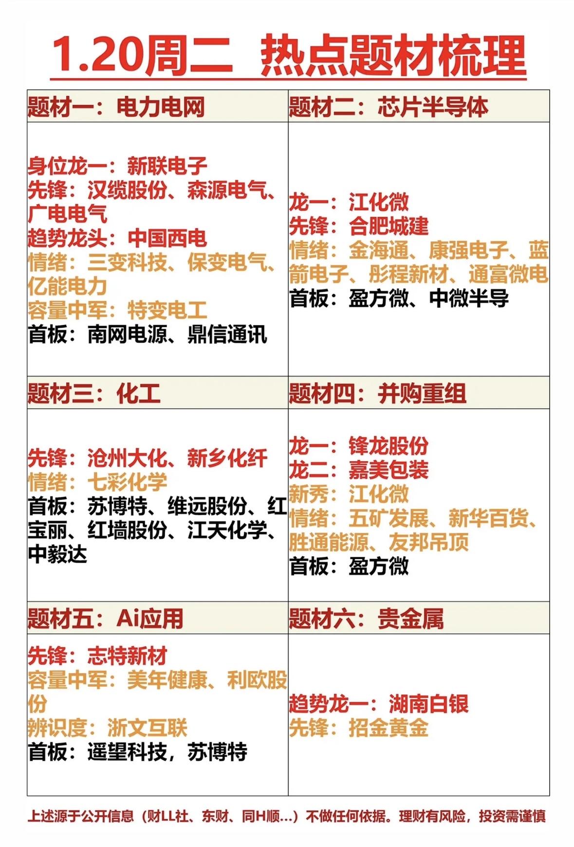 1.20周二热点题材梳理:电力电网、芯片半导体、化工、并购重组、AI应用、贵金属 电力电网与芯片半导体领涨,化工并购重组活跃,AI应用贵金属异动,市场热点轮动加速,投资需理性。