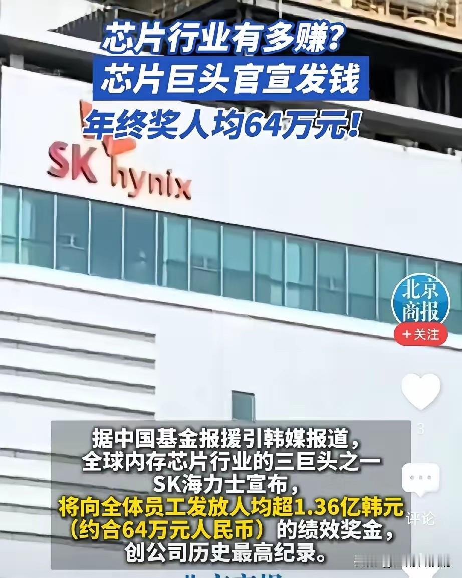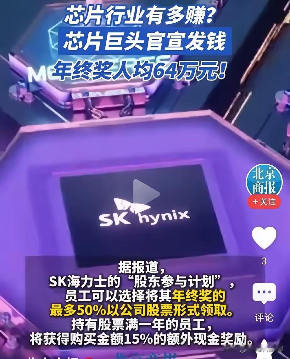最近芯片圈的消息看傻网友了!全球内存芯片巨头SK海力士,居然给员工发了人均64万元的年终奖,创了公司历史最高纪录,这波土豪操作真的让人实名羡慕! 能这么大方撒钱,核心还是赚得盆满钵满。自从去年以来,AI人工智能彻底火了,大模型训练、数据中心扩容都得靠内存芯片撑着,需求直接暴增。现在一根高端服务器内存条都能卖到好几万,有的甚至能抵上上海一套小房子的价格,内存芯片直接从普通配件变成了"硬通货"。 作为全球三大内存芯片厂家之一,SK海力士赶上了这波超级牛市。不仅DDR5这类内存价格暴涨300%以上,公司股价更是从去年底到现在涨了275%,2025年的营业利润预计接近45万亿韩元,利润率飙到47%的历史峰值。更夸张的是,2026年的全部芯片产能都已经售罄,订单排得满满当当。 这次的年终奖据说还不是固定数额,公司还出了福利升级:员工能选把一半年终奖换成公司股票,持有一年还能多拿15%的现金奖励。这意味着只要公司继续赚钱,员工还能再赚一笔,相当于双重福利。 不得不说,AI浪潮真是带飞了整个产业链。海力士员工的天价年终奖,既是公司业绩爆棚的证明,也让大家看到了高端科技产业的爆发力。你身边有这么给力的年终奖吗?来评论区聊聊吧! 海力士芯片