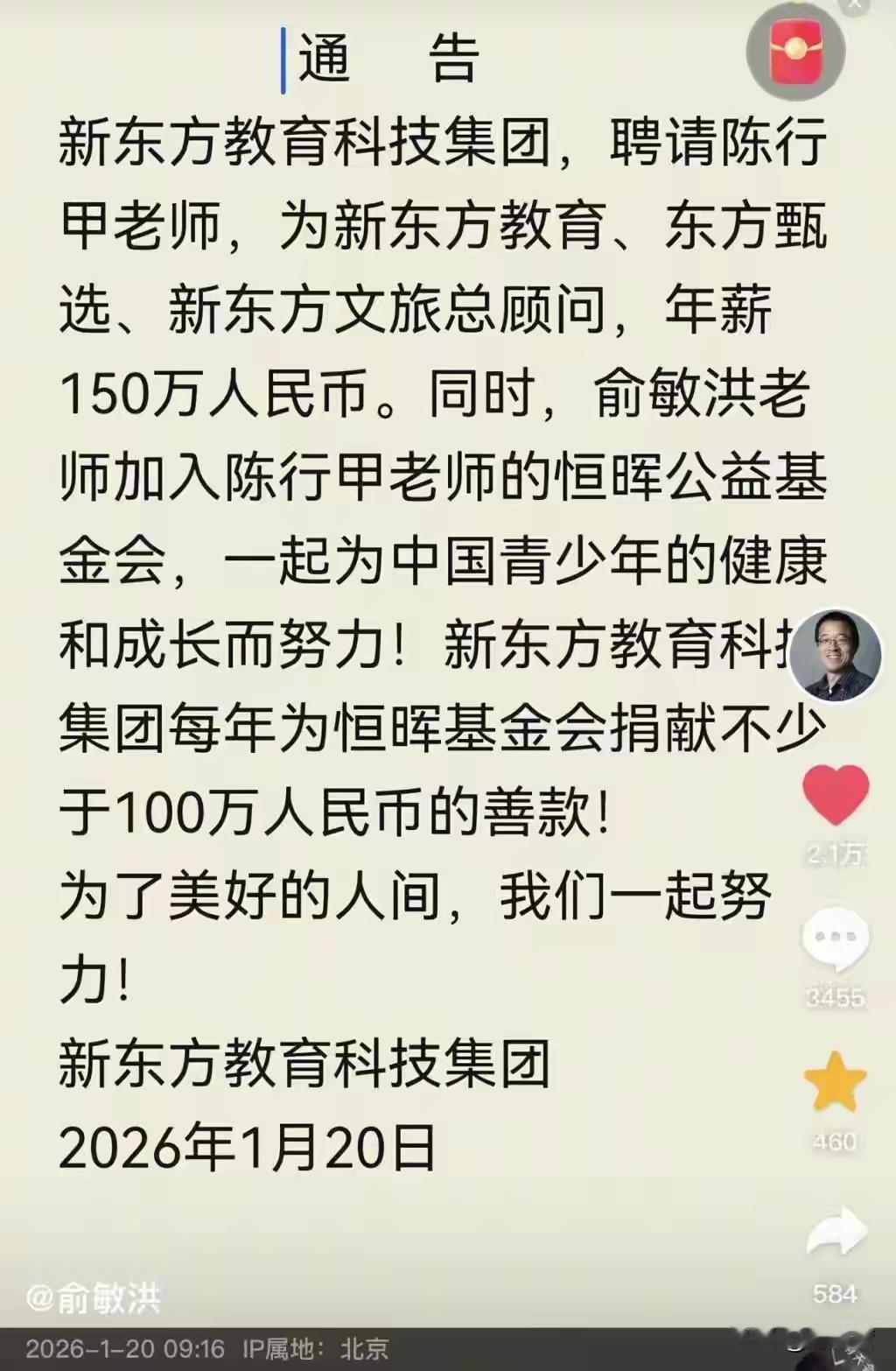 陈行甲73万公益年薪引争议后,新东方官宣150万年薪聘其为总顾问! 1月20日,俞敏洪在社交平台发布新东方通告,正式聘请陈行甲担任新东方教育、东方甄选、新东方文旅总顾问,年薪150万元。这一消息曝出,距离陈行甲因公益年薪引发争议仅过去数日。 此前,恒晖公益基金会2024年年报显示,陈行甲作为副理事长,当年税前薪资约73万元,2023年其薪资更是达到90.27万元,这一数字引发部分网友对公益人高薪的质疑。对此,基金会工作人员回应,财务支出均经审计,民政部门核查后确认无问题,也有不少网友表示,公益人拿合理薪酬无可厚非。 1月18日晚,陈行甲发布视频宣布,将启动交接程序,把基金会的工作交棒给年轻人,完成过渡后不再从基金会领取薪水。 此次新东方的聘任公告还提到,俞敏洪将加入恒晖公益基金会,新东方每年还会向该基金会捐赠不少于100万元善款,双方将携手助力青少年健康成长,这一跨界合作也让不少网友感慨,实现了公益与教育的双向奔赴。