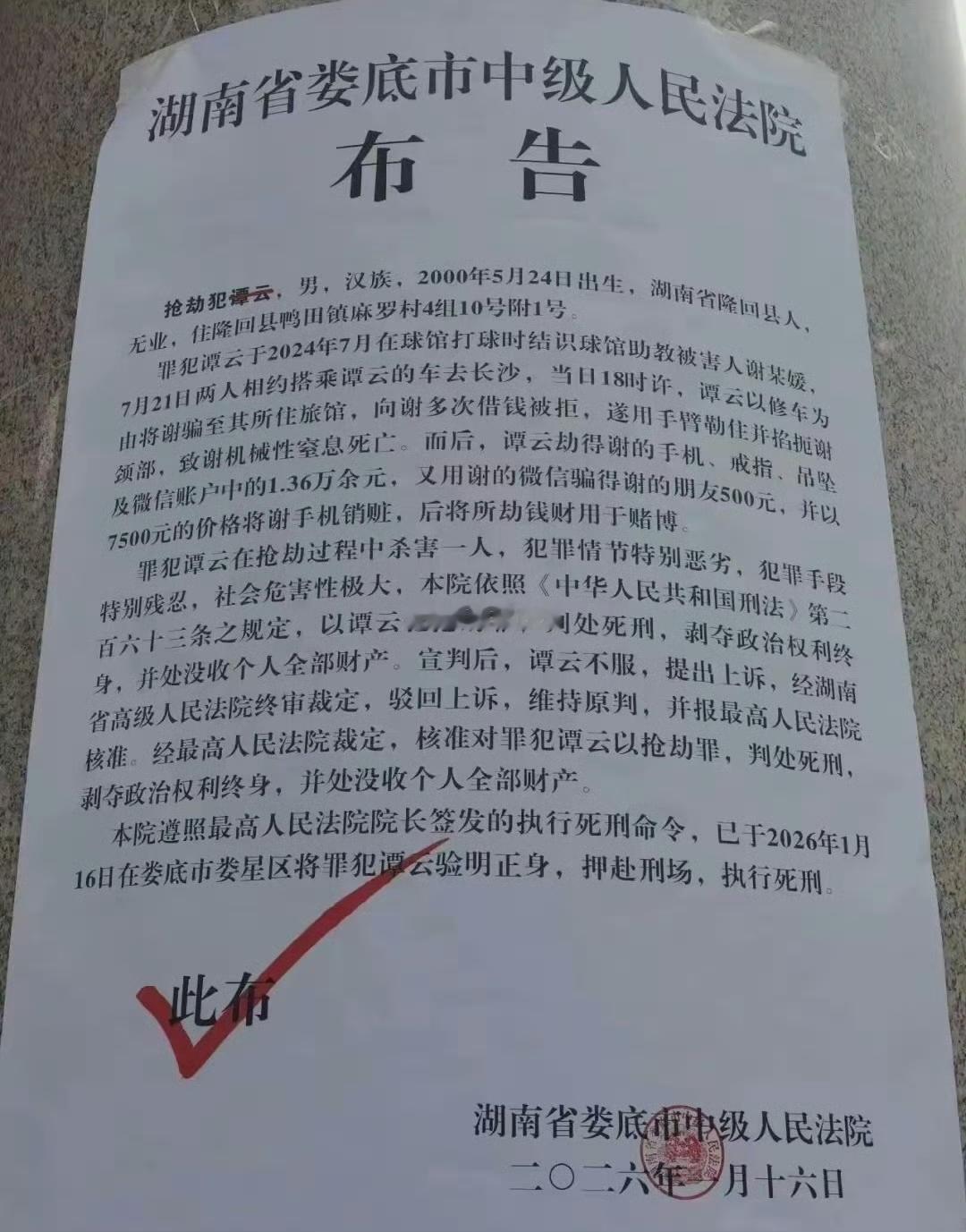2026年的第一份公开的死刑布告,26岁的湖南隆回人谭云,抢劫杀人,一看作案经过就是个没脑子的。台球厅认识的女孩,相约到长沙就找人借钱,不借就变成杀人抢劫。女孩的首饰,手机,还有微信里的1.36万多元的现金,总共价值两三万,为这点钱就把人家的命给剥夺了。判死刑,罪有应得。死缓罪犯