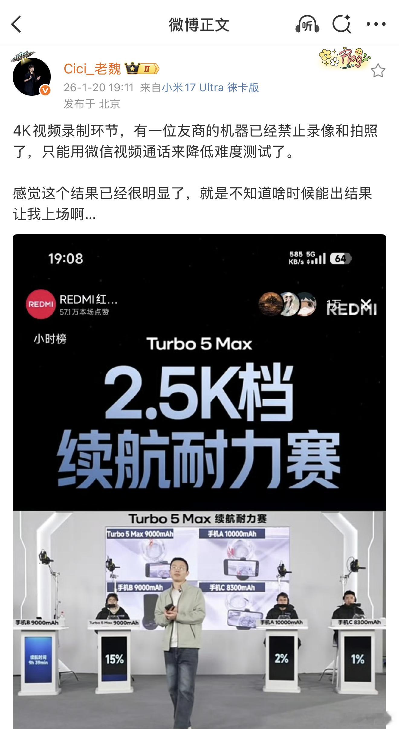 Turbo5Max 续航耐力赛,某友商竞品低电量时禁止拍照和录视频了,只能换别的项目按目前这个局面,老魏估计还要继续加班挺久~ 佛山