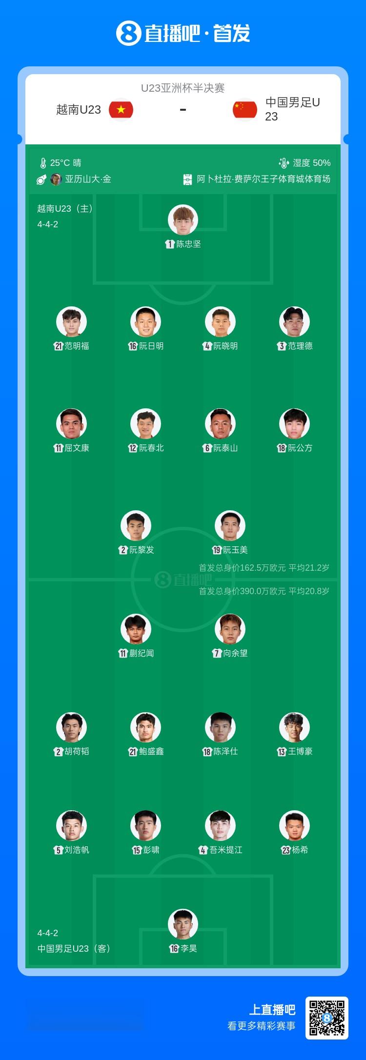U23国足对阵越南首发: