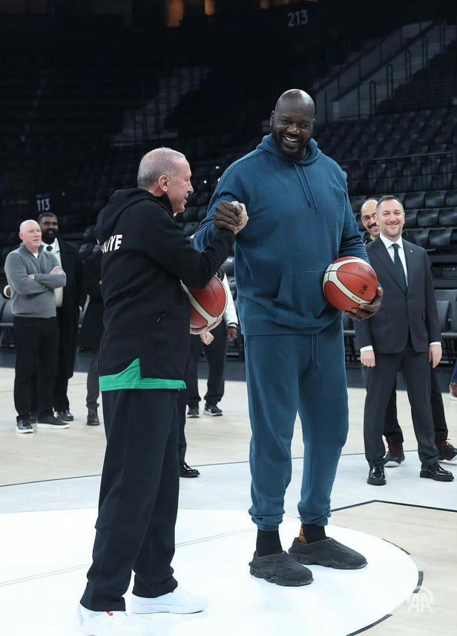 土耳其总统埃尔多安在伊斯坦布尔与NBA传奇球星沙奎尔·奥尼尔会面,并与他打了一场友谊赛。