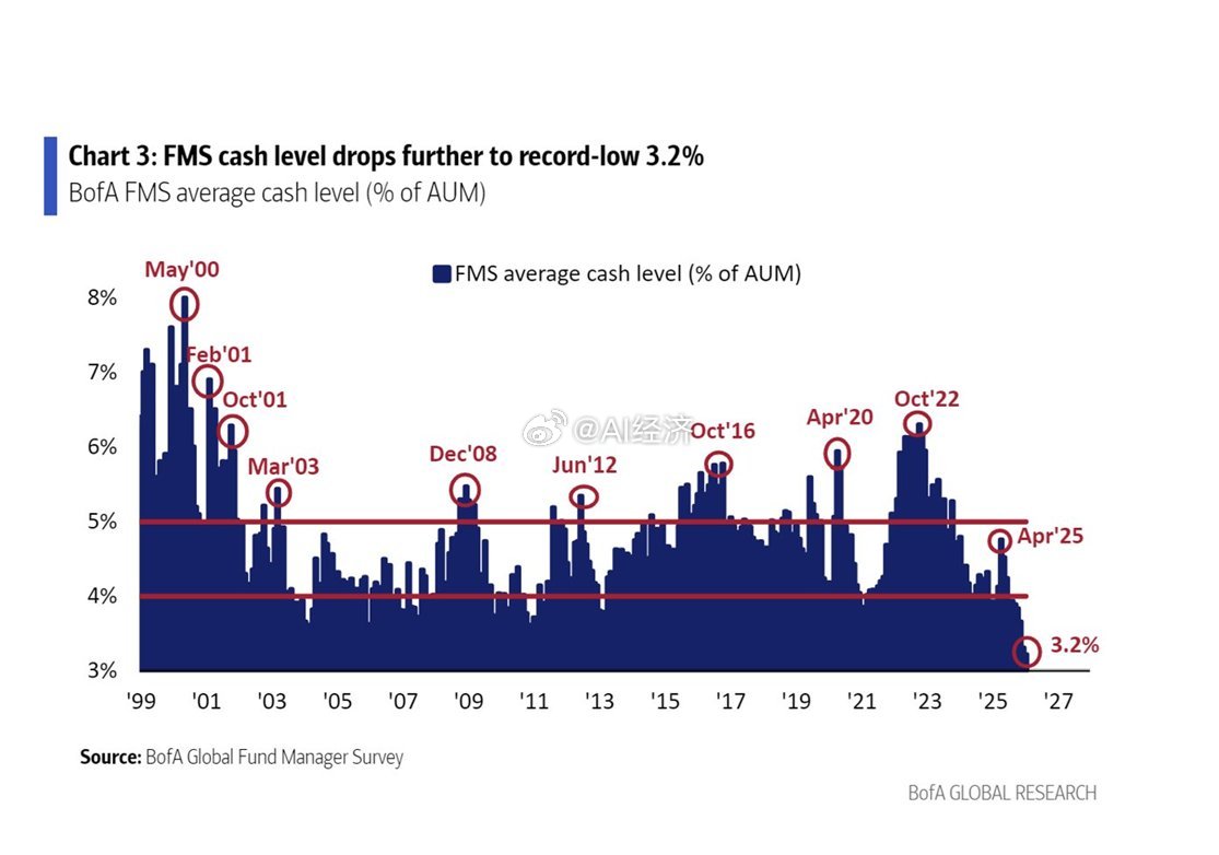 美银1月基金经理调查显示,全球投资者自2021年7月以来最乐观,因全球增长预期飙升。同时现金水平创历史新低,为3.2%,防御回调的水平为2018年1月以来新低。牛熊指标环比升0.1至9.4的“超级牛市”水平,暗示增加风险对冲和避险。地缘政治冲突自2024年10月以来首次成为最大尾部风险,AI泡沫排名第二。
