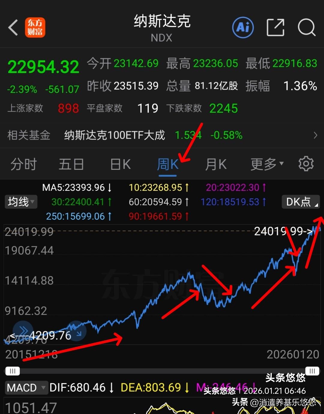最近两个多月买美纳斯达克的人估计都没有赚到钱,还不如买A股赚钱效应好。 有人说什么时候买美股都是对的,这样说是看你做短线还是做长线,你要是做短线,切入点好正赶上持续上涨肯定赚钱,否则白玩! 看看它最近两个多月走势,基本上都是震荡整理行情,根本没有涨,反而下跌! 你要是做长线,持有一年或者更长时间,不在乎短线波动,整体上是赚钱,基本上不可能出现亏损,这点比A股保险一点。 纳斯达克涨起来如蜗牛,天天零点几,不如A股一天涨幅,赎回还要7天以上才能到账,想把资金切换到A股黄花菜都凉了! 之所以有很多人喜欢美股纳斯达克,是因为A股不争气,一年下来涨少跌多,大多数时间都是震荡整理或者震荡下跌,都让A股给跌怕啦! 但是,一旦A股行情起来,走好走稳,赚钱效应肯定比纳斯达克好,一天涨的赶超美股好几天,其实A股2025年以来赚钱效应就不错,只要你把握好波段,不贪心,收益会比美股多。 所以喜欢玩长线,当做存定期,不追求高回报,赚快钱,适当配置纳斯达克也不错。 以上观点仅供参考不构成投资依据。点赞转发关注投资理财不迷路。