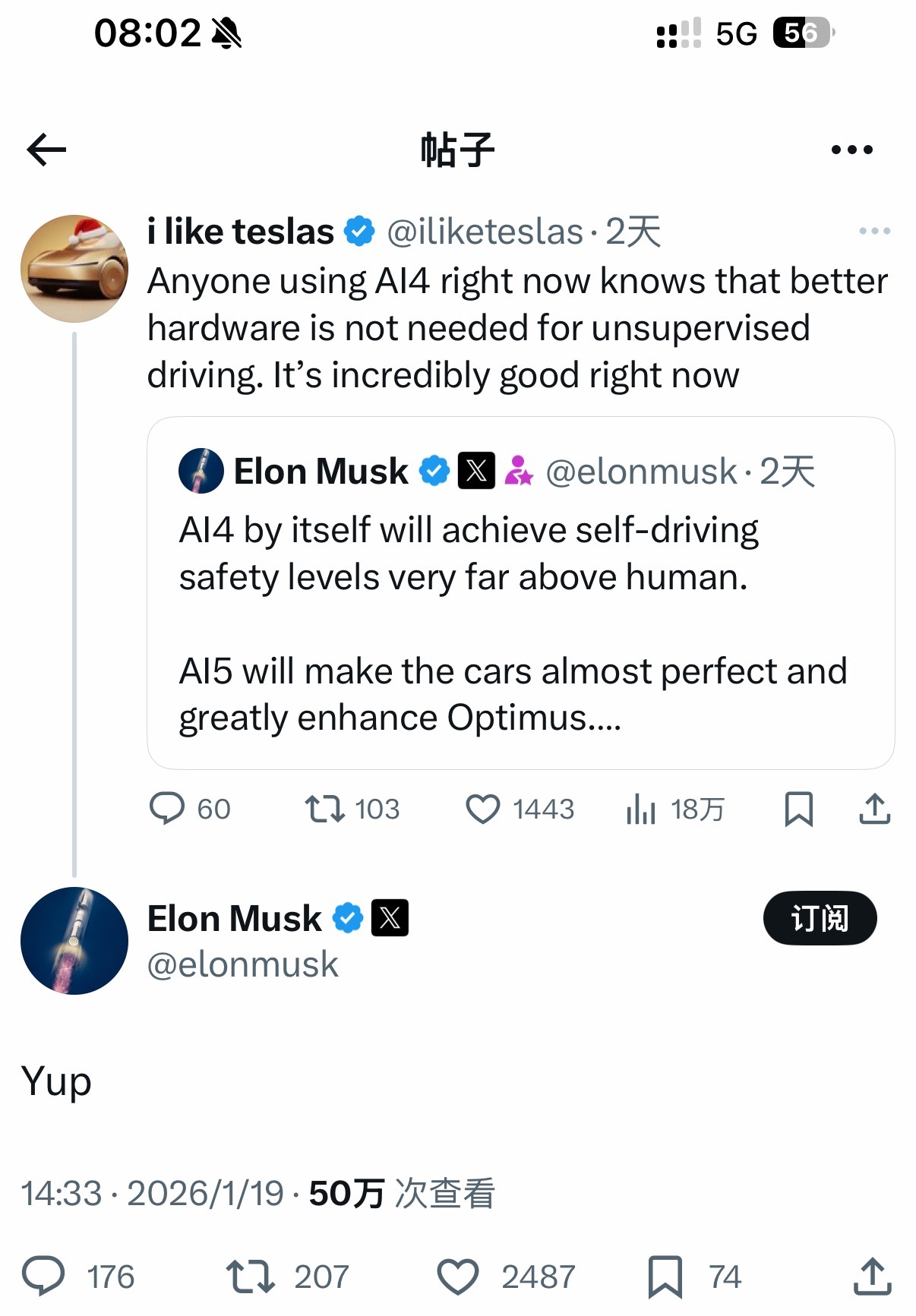 马斯克确认 AI4 芯片无需额外升级即可实现无人监管的 FSD(完全自动驾驶)。