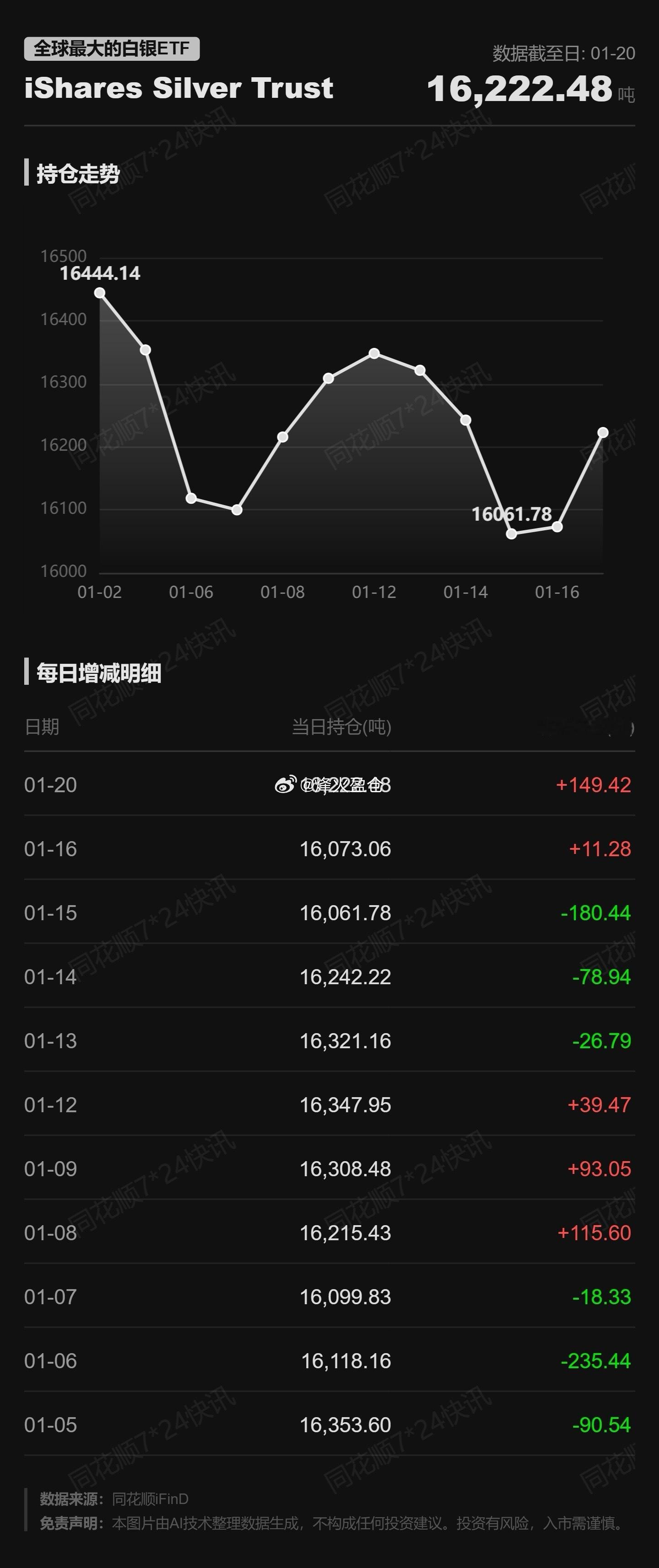 全球最大的白银ETF iShares Silver Trust持仓量较前日增加149.42吨 截至2026年01月20日,全球最大的白银ETF iShares Silver Trust持仓量为16222.48吨,较前一个交易日增加149.42吨。