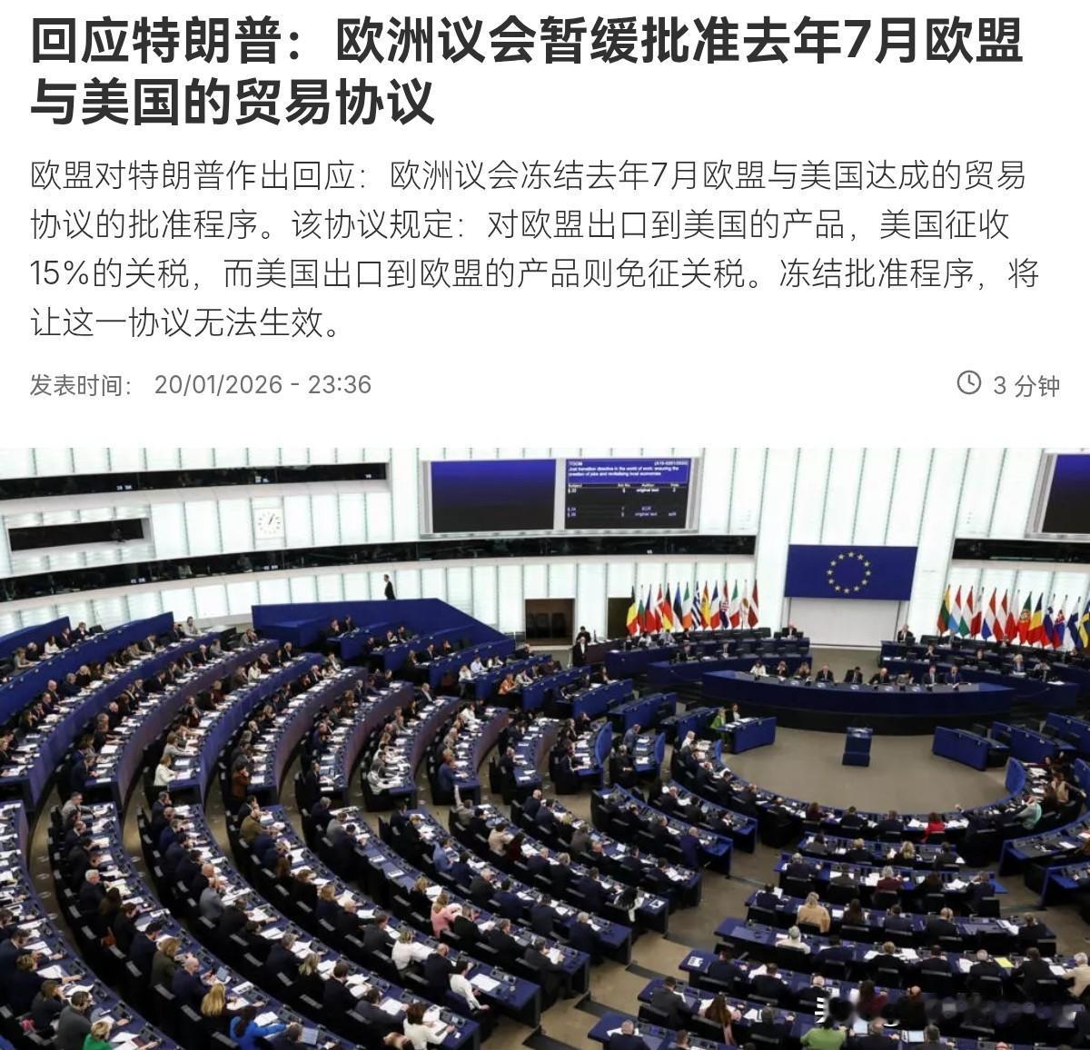 欧洲终于对美国硬了一回!欧洲对美国进行反击!1月21日,根据法新社报道,鉴于美国以加税威胁欧洲在格陵兰岛问题上让步,欧洲正式对美国进行回击。欧洲议会冻结了去年7月欧盟与美国达成的贸易协议的批准程序。欧洲启动这一冻结程序意味着什么呢?这意味着欧洲与美国谈定的关税条款,将不会生效。 事实上,该协议明显是单方面有利于美国的,而被冻结之后,美国出口到欧盟的产品将不会获得免征关税的资格,欧盟对美国将继续维持原关税。说的直白一点,也就是美欧关税谈判一下子又回到了原点。虽然欧洲议会仍需就此进行正式表决,但鉴于主要政治团体已达成一致,该协议被冻结几乎没有悬念。 很显然,估计美国也没有料到欧洲这一次会这么硬。事实上,就在欧洲要冻结该协议之前,美国财长贝森特就对欧洲喊话称,我呼吁在座各位冷静下来,深呼吸,静观其变。我敦促所有国家坚持履行各自的贸易协定。但显然贝森特的喊话一点作用都没有。而事实上,在正在举行的达沃斯论坛上,法国总统马克龙,欧盟委员会主席冯德莱恩都对美国公开表达不满。 现在欧洲已经出手,接下来就看美国如何应对,如果美国继续对欧洲来硬的,欧洲铁定会冻结该协议不说,而对美国930亿欧元的美国商品加税,抛出美国国债,都可能是欧洲的选项。很显然,欧洲看起来已经不准备对美国让步。如果局面朝这个方向发展,美国国内债市,股市,汇市大概率又会出现剧烈震荡。