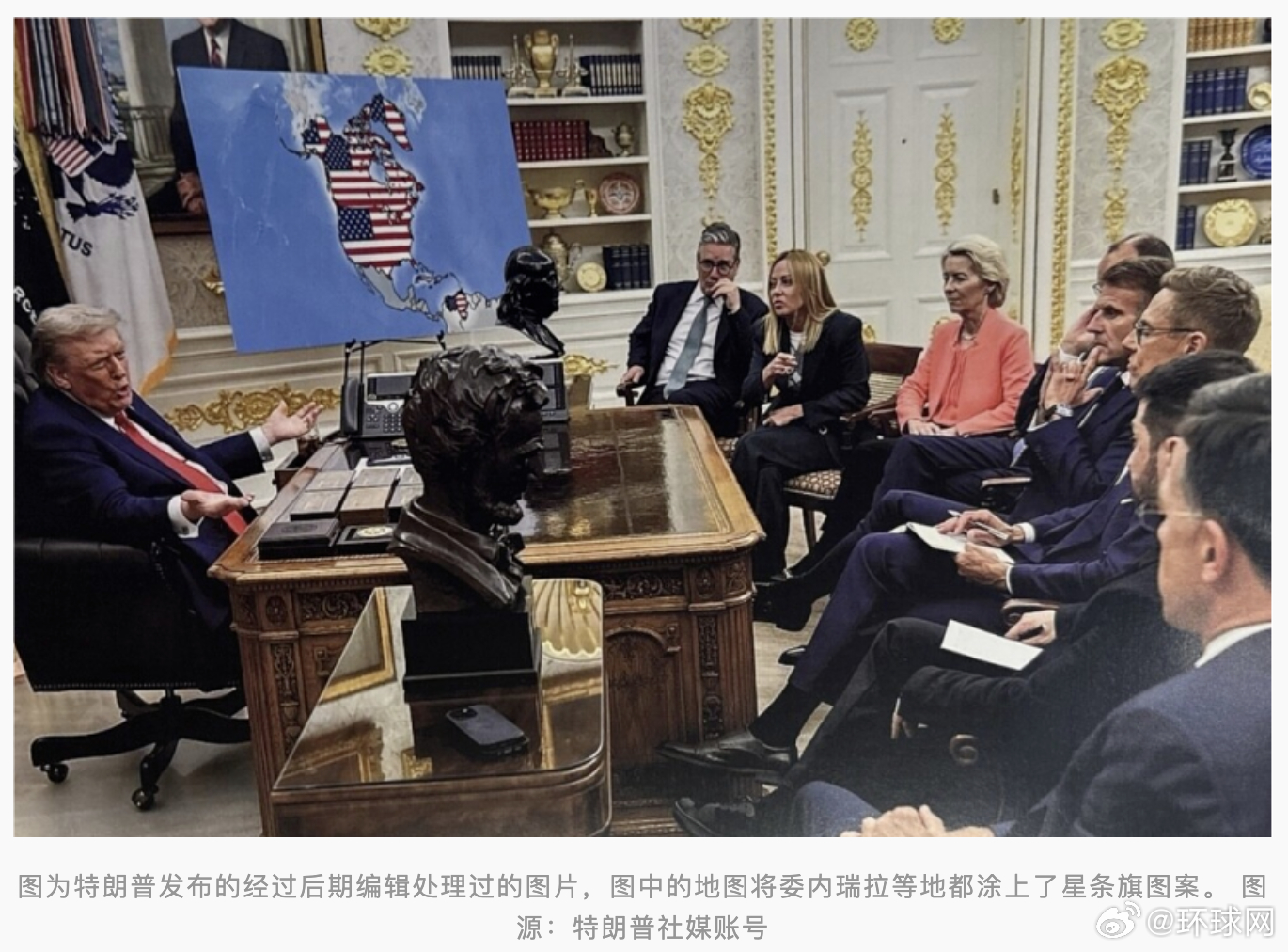 【#特朗普发P图将委内瑞拉涂上星条旗#,委政府呼吁民众发布官方地图打击“虚假信息”】#委内瑞拉呼吁民众发布官方地图打假# 据路透社报道,美国总统特朗普当地时间20日在社交媒体上发布一张经过后期编辑的图片,并在图中的地图上将委内瑞拉等地都涂上了星条旗图案后,委内瑞拉政府同日发表声明,呼吁其公民在社交媒体上发布该国的官方地图,作为一项“象征性行动”。委内瑞拉政府在一份声明中表示:“鉴于这种情况,委内瑞拉呼吁所有公民团结一致,采取象征性行动,以捍卫领土完整并打击虚假信息。”报道称,委内瑞拉政府敦促民众在社交媒体上发布委官方的国家地图。在特朗普发布的图片中,特朗普在白宫椭圆形办公室面对一众欧洲国家领导人及乌克兰总统、欧盟委员会主席等人,旁边摆放的地图,则将加拿大、丹麦自治领地格陵兰岛和委内瑞拉都涂上了星条旗图案。美军3日凌晨对委内瑞拉发动大规模军事打击,强行控制委总统马杜罗夫妇并将他们带到美国。特朗普政府宣称将“管理”委内瑞拉,并开采其巨大的石油储备。