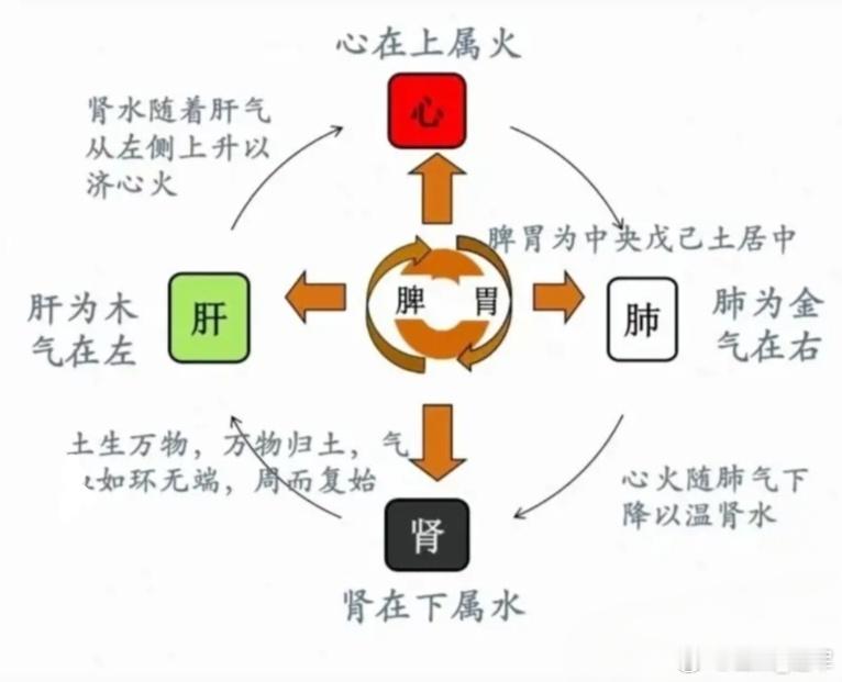 肝脾左升肺金右降葵水上承,温暖了己土,滋润了乙木,己土之气开始上升,乙木之气开始升发,当木土之气上升到顶部之时, 就会在这里遇上丁火和辛金之气,丁火本来是向上的但由于金气的收敛和肃降作用,丁火会随着金气下降,一直降入葵水;与此同时,戊土之气也随着金气和丁火一 起下降;戊土之气下降,甲木之气便会随着戊土之气一起下降,乙木和葵水之气从左边升,戊土和甲木之气从右边降,一升一降,一左一右,便构成了人体之气的圆运动,生生不息周而复始。