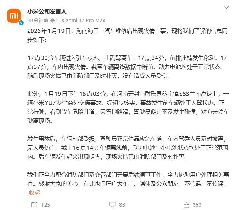 一天两辆小米汽车起火,雷军的苦恼停不下来。就在19日一天,小米汽车发生了两起事故,先是在下午4点,河南开封高速公路上,一辆小米YU7与一辆货车发生碰撞起火,事件原因基本清楚,小米汽车正常行驶,货车危险驾驶并道,小米汽车驾驶员因雪天路滑避让不及发生碰撞起火爆燃,肇事货车逃离现场。 当日下午5点半发生在海口的一家汽车维修店的小米汽车起火事故,更典型也更值得深究。小米的回应指出,5点半车辆驻车,4分钟后前排座椅发生移动,7分钟后车内着火。跟河南高速事故类似,起火后很快整辆车进入爆燃状态,最后几乎都烧成了一堆废铁。 小米汽车的回应很有意思,明确表示两起事故在真正进入事故状态前一刻,动力电池均处于正常工作状态。这是雷军最在意的,他们都很清楚,这也是大家最关心最害怕的,言外之意就是说,小米汽车的起火跟电池无关。但至于是不是跟小米无关,现在都还不好说,河南高速事故碰撞起火爆燃,尚且情有可原,这种事故其他国产车企都经历过,可以说这是业液态电池还没有解决的通病。 可海口维修店静止状态发生起火爆燃,小米很难说得清这跟车辆完全无关,此前类似静止状态自燃的事故,多跟天气和车主不小心在车内放了容易起火的物品有关。但海口这次,车辆是停在维修店内的,只是移动座椅就发生起火,事故原因究竟出在哪里,小米和雷军肯定更在意。而这也是大家最关心和纠结的地方,都有待正式调查给出答案,没必要过多猜疑,搞不好会招来小米法务的铁拳。