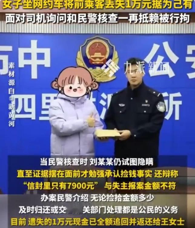 捡万元现金拒不归还还狡辩?济南女子被拘留:贪念面前,底线不能丢 “不是自己的东西,拿了真的能安心吗?”济南这起网约车丢钱事件,戳中了无数人的神经。女乘客刘某某上车时发现后座的信封,打开见是一沓现金,竟趁司机专注驾驶悄悄收入囊中,面对司机询问和民警核查,还两次撒谎抵赖,先是一口咬定“没看见”,被戳穿后又辩称“只有7900元”,试图蒙混过关 。最终,这1万元现金全额追回返还失主,而刘某某因涉嫌盗窃被依法行政拘留,为一时贪念付出了沉重代价。 或许有人觉得“捡来的钱,不还也没啥”,但这早已不是道德层面的小事,而是明确的违法行为。《民法典》第三百一十四条清清楚楚规定,拾得遗失物必须返还权利人或送交有关部门,拒不归还且数额较大的,就可能触犯《刑法》中的侵占罪 。刘某某大概忘了,如今网约车有行程轨迹、车内有监控录像,警方调取证据不过是时间问题,想用谎言掩盖贪心,终究是自欺欺人。 更让人唏嘘的是,这1万元对失主王女士而言,或许是急用的生活费、给家人的医疗费,或是筹备许久的款项。她发现钱丢失时的焦灼与慌乱,刘某某在将信封塞进包里的那一刻,恐怕从未想过。同样是面对他人遗失的财物,有人选择坚守底线,有人却被贪念冲昏头脑。深圳00后小伙捡到百万金条,第一反应是交给交警;济南网约车穆师傅捡到贵重公文包,连夜送还失主,还说“诚信是做人的基本” ;武汉10岁男孩在地铁站捡到近万元现金,当即上报工作人员,领到了“文明好乘客”纪念卡片 。 这些对比之下,更显刘某某行为的糊涂。她不仅没占到便宜,反而留下违法记录,影响个人征信与生活,真正应了“贪小便宜吃大亏”。其实网约车遗失物品的处理有明确流程,乘客可通过平台联系司机,司机有义务协助返还,必要时警方会快速介入,就像济南新郎丢失5万元礼金,民警40分钟就帮忙找回。可刘某某偏偏选择了最愚蠢的方式,既违背了公序良俗,又触碰了法律红线。 这起事件给所有人提了个醒:君子爱财,取之有道。网约车出行早已融入日常,谁都可能不小心丢东西,也可能捡到别人的物品。多一份善意,少一份侥幸,捡到财物及时归还或上交,既是履行法律义务,也是守护内心的道德底线。反之,被贪念驱使的一时糊涂,终将付出代价。 如果是你捡到万元现金,会第一时间联系失主吗?欢迎在评论区聊聊你的看法!诚信感悟 网约车丢物