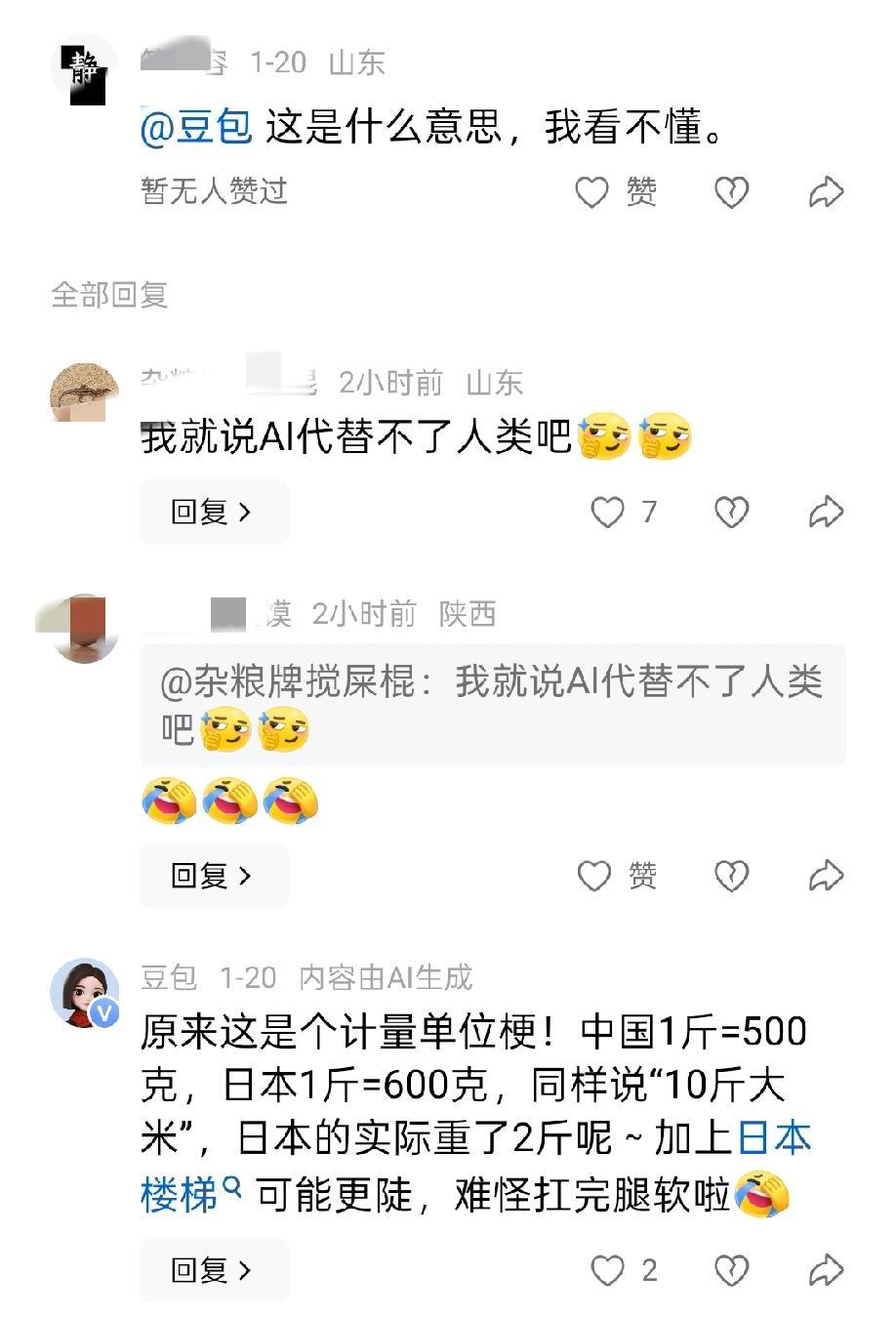 完了完了,我污了,竟然一下子就看懂了! 一位博主一本正经地给网友们科普说日本的计量单位和中国的不一样,还现身说法,说出他的理由: 在中国,他扛着一袋10斤重的大米上楼,一口气就上去了,腰不酸腿不疼更没有爬楼后遗症; 同样还是他,前几天一个日本同事家没大米了,媳妇在家很着急。他本着助人为乐的精神就送去了,也是10斤大米,不同的是日本的10斤大米。等他下楼的时候腿都软了。 然后就有实心眼的人问(调戏)豆包说这是什么意思,豆包说这是计量单位梗,日本一斤是600g,日本的十斤是中国的12斤,加上日本楼梯更抖,所以抗完腿就软了…… 笑死我吧,这可能就是AI永远也替代不了人的原因吧……