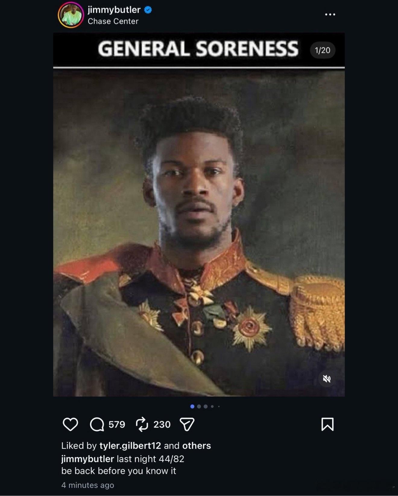 NBA 勇士球迷这些年受到的打击,一直在延续……巴特勒更新了一张照片,老球迷应该都记得,当年他跟森林狼管理层闹别扭后,申请了交易,然后以肌肉酸痛为由长时间缺席比赛,森林狼就给他P了这么一张图,称他为酸痛将军。巴特勒安慰球迷巴特勒受伤时还在开玩笑
