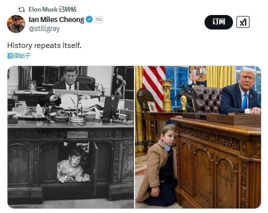马斯克晒儿子和特朗普, 怎么主角成了小孩? 马斯克在社交平台, 发了儿子小X和特朗普的合照。 四岁的小X, 在白宫椭圆办公室里, 动来动去 。 学爸爸手势 , 还摸马斯克耳朵。 特朗普笑着说, 他人聪明很棒。 马斯克还放了小X, 和小肯尼迪当年玩的对比图。 本来像是他, 和特朗普关系缓和的场面 。 大家眼光却, 落在小孩身上。 有人笑说小X, 抢光风头 。 白宫最酷娃是他。 两个大人同框 , 怎么赢的是孩子。 是不是这种不经意的鲜活 , 比场面话更让人记得住。