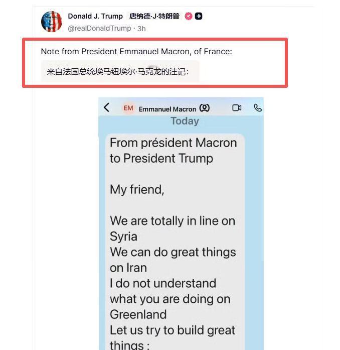 特朗普又走了一步臭棋! 他公开了马克龙发给他的短信,这无异于自掘坟墓。 特朗普公开马克龙短信与柬埔寨洪森公开录音有什么区别呢?特朗普明显就是想教训一下马克龙,让他认清自己,认清法国该干什么,该怎么配合! 据《金融时报》披露,马克龙在短信中提出"周四巴黎G7特别会议"构想,邀请乌克兰、丹麦、叙利亚及俄罗斯代表参会,并强调"法美在叙利亚、伊朗问题立场完全一致"。 然而特朗普不仅拒绝这一提议,反而以200%关税威胁法国葡萄酒产业,迫使马克龙妥协。 更令人咋舌的是,特朗普同步发布AI合成的"美国领土扩张图",将加拿大、格陵兰岛纳入版图,配合其对欧洲8国加征10%关税的威胁,形成经济、军事、舆论三重施压链条。 相较于柬埔寨洪森公开泰国总理佩通坦录音以行国内政治清算、打击政敌之策,特朗普的行动更显战略系统性,他的谋划似经通盘考量,更具长远布局之深意。 洪森事件本质是边境冲突引发的内部权力斗争,而特朗普公开马克龙短信则是系统性外交羞辱,通过摧毁盟友间的信任基础,迫使欧洲在格陵兰岛、伊朗等关键议题上妥协。 这种"私人信息武器化"的升级版操作,标志着跨大西洋联盟正从"价值观同盟"滑向"利益博弈场"。 特朗普此举暴露了美国对欧洲战略价值的根本性重估,气候变暖提升格陵兰岛战略价值后,美国试图通过"购买"或军事威慑控制北极航道,欧洲在俄乌冲突后能源依赖加剧,美国借机抬高关税筹码,伊朗"抵抗之弧"崩溃后,欧洲试图协调伊朗政策却被视为"可收割的弱点"。 这种三重逻辑驱动下,美国已将欧洲视为"可抽血对象"而非平等伙伴。 特朗普的"短信外交"实为权力游戏的破局之举,但其后果可能适得其反,短期看,欧洲虽在军事上依赖美国,但经济反制已显韧性,欧盟启动"反胁迫机制"准备对美商品加征关税,黄金、白银价格创新高即反映市场对冲突升级的担忧。 长期看,这种"羞辱外交"将加速欧洲战略自主进程,德国提出"欧洲军"构想,法国推动"反胁迫工具"常态化,标志欧洲从"美国附庸"向"独立一极"转型。 更深层看,私人通信本应是外交决策的"安全阀",却被政治操弄为攻击工具,这种"破窗效应"正侵蚀国际规则的权威性。 未来国际秩序重建需回归多边主义而非单边强权,正如马克龙所言:"外交不是私人恩怨,而是国家利益的博弈," 当特朗普将私人短信变为政治武器时,他不仅自掘坟墓,更在摧毁国际信任的基石,而这才是真正的"臭棋"。