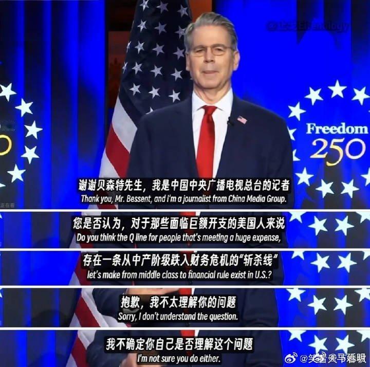 美国财长贝森特还在为“斩杀线”狡辩,还要糊弄老百姓。有本事和沈逸老师连线,他可是吃了苹果,脱过敏的国际政治的大学者。想糊弄他,没门。