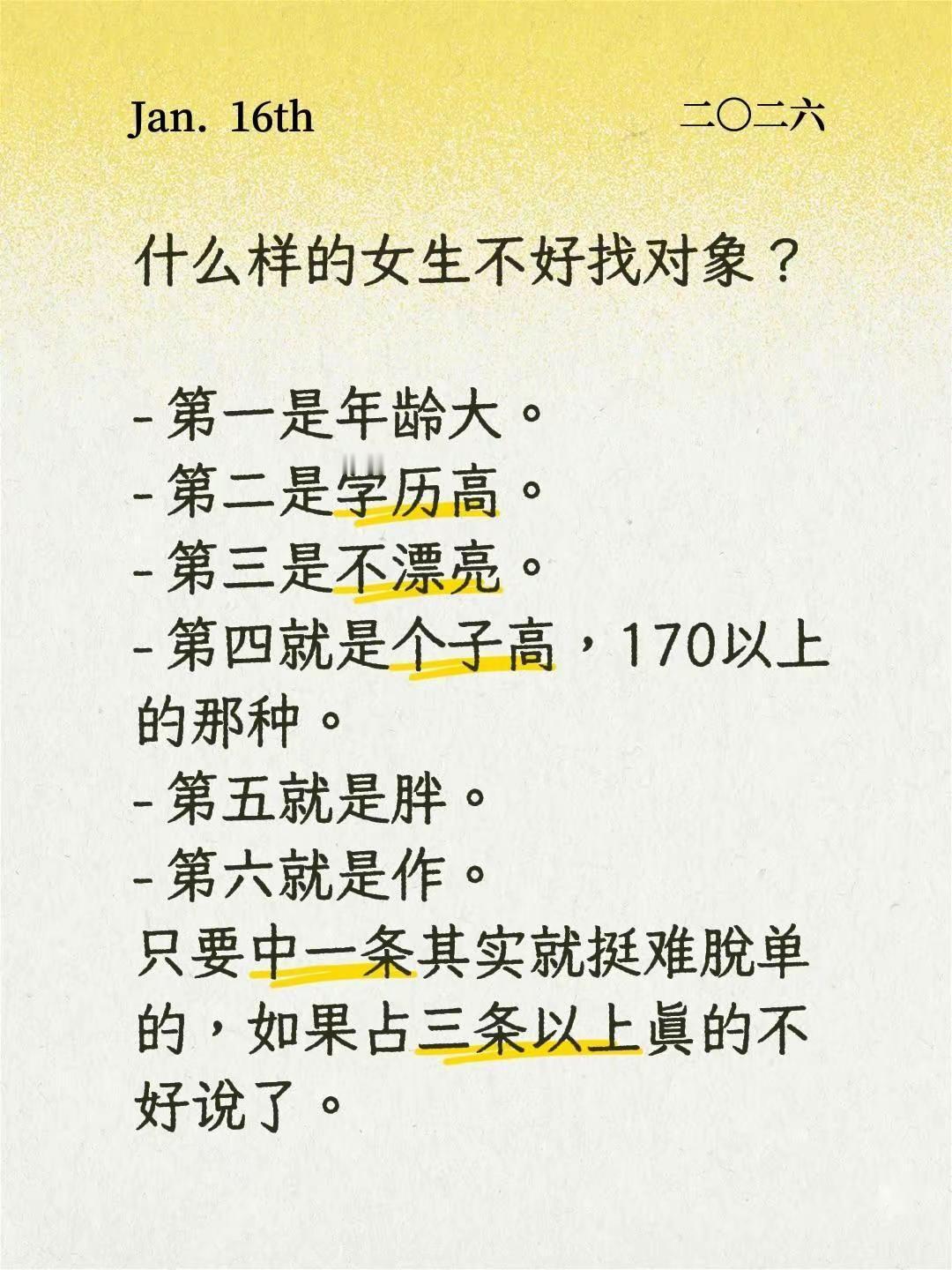 我评论了@通州鸿娘 的作品:什么样的女生不好找对象? - 第一是年龄大。- 第二是学历高。- 第三是不漂亮。- 第四就是个子高,170以上的那种。- 第五就是胖。- 第六就是作。只要中一条其实就挺难脱单的,如果占三条以上真的不好说了。