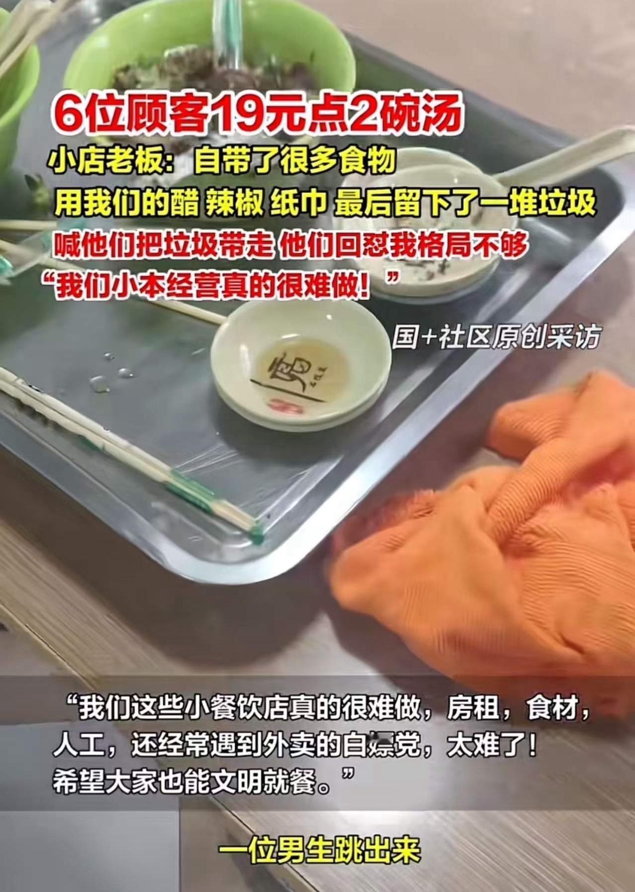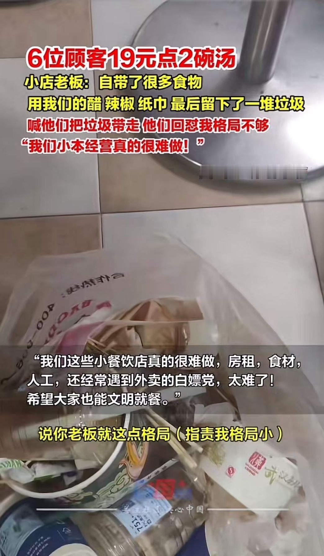上海,6位顾客自带食物去餐馆吃饭,只花19元点2碗汤,用店里的醋、辣椒、纸巾,最后留下一堆垃圾。老板喊他们把垃圾带走,顾客回怼:“你这格局做什么生意!”老板:“我们小本经营真的很难!” 自带食物“蹭服务”,顾客与餐馆的“格局之争”谁之过? 近日,上海一家餐馆内上演了一场令人唏嘘的闹剧:6位顾客自带食物前来就餐,仅花费19元点了2碗汤,却肆意使用店里的醋、辣椒、纸巾等物品,用餐结束后还留下一堆垃圾,老板无奈要求他们带走垃圾,却遭顾客回怼“你这格局做什么生意”,老板则委屈表示“我们小本经营真的很难”。 从顾客角度看,他们自带食物或许有自身考量,可能是出于节约成本,或是想品尝自己准备的美食。但只点两碗汤,却大量使用店内调料和纸巾,这无疑是在“薅羊毛”。餐馆提供调料和纸巾等,本是为正常消费的顾客服务,而他们这种近乎“零成本”享受服务的行为,显然超出了合理范畴。用餐后留下垃圾,更是缺乏基本素质和公德心的体现。当老板要求带走垃圾时,不仅不反思自身行为,还指责老板“格局小”,这种强词夺理、倒打一耙的态度,实在让人难以认同。 再看餐馆老板,小本经营本就不易,每一份收入都凝聚着辛勤的汗水。面对顾客这种不合理行为,提出带走垃圾的要求合情合理。然而,却遭遇顾客的无理回怼,心中的委屈可想而知。在市场竞争激烈的当下,小餐馆本就面临着房租、食材成本、人力成本等多重压力,如此“蹭服务”的行为,无疑会让他们的经营雪上加霜。 这起事件看似是一场普通的纠纷,实则反映出部分消费者规则意识和公德意识的缺失。在享受服务的同时,我们应当尊重商家的劳动成果,遵守基本的消费规则。而商家在维护自身权益时,也应采取合理合法的方式。 良好的消费环境需要商家和消费者共同营造。消费者应多一些理解和自律,商家也应多一些包容和智慧。只有双方相互尊重、相互理解,才能避免类似的闹剧再次上演,让消费市场更加和谐有序。上海,6位带餐去饭店吃饭 19元点2碗汤 "蹭服务"