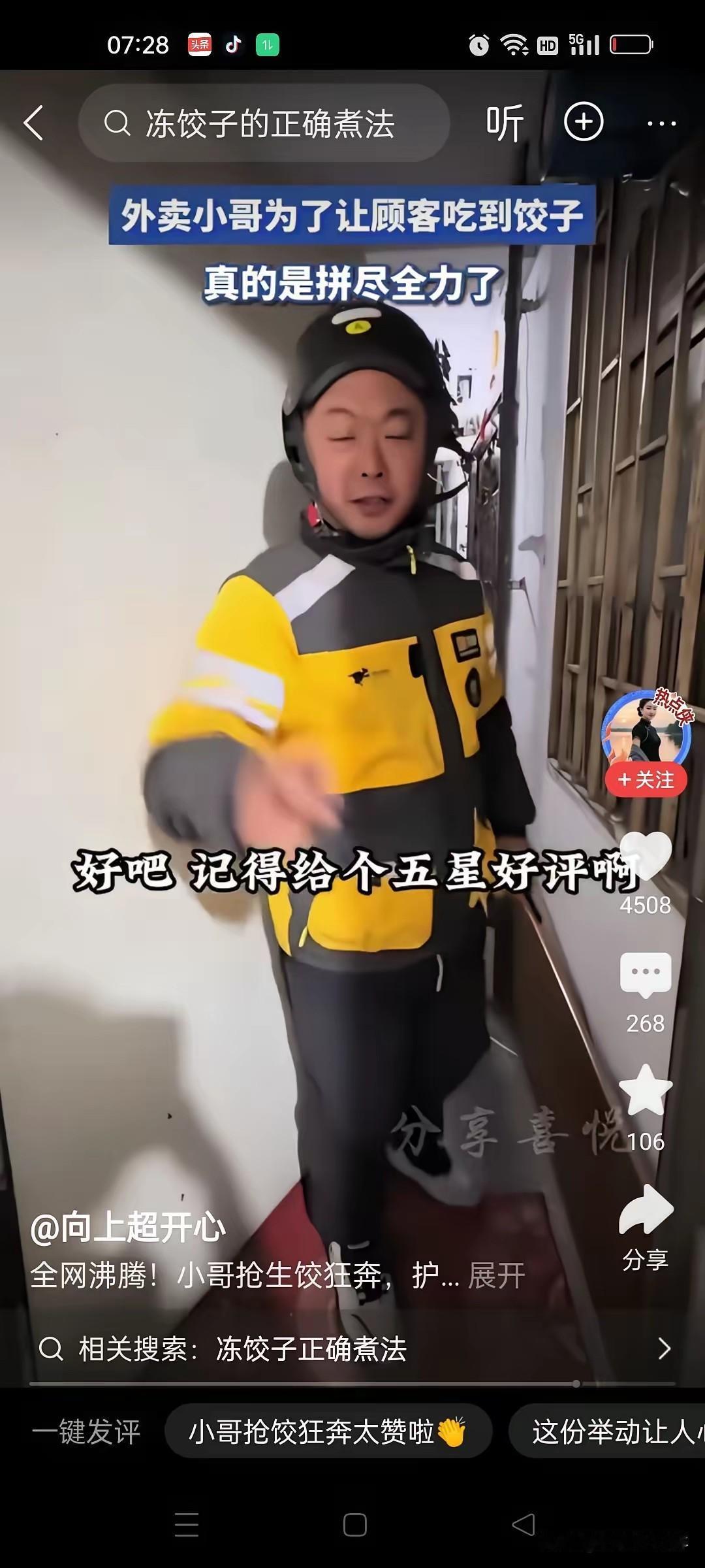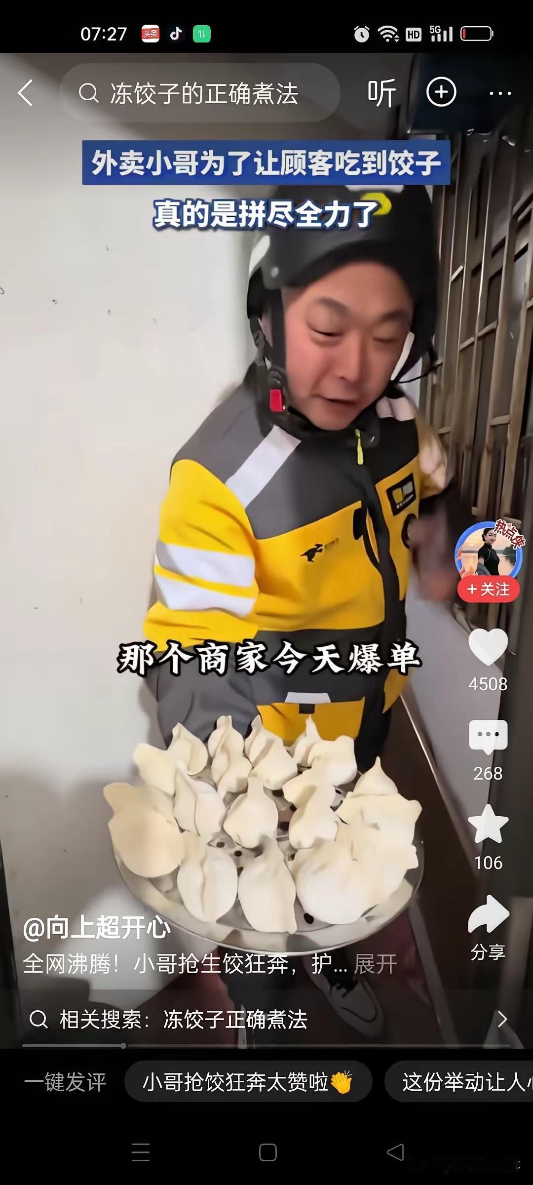外卖小哥给客户送来饺子,却是生的。客户说,这不是我点的。我点的是水饺。你怎么给我送来生的呢?小哥说,今天客户爆单,煮不过来。外卖小哥都在干仗了。 我趁他们不注意,上厨房端一盘就给你送过来了。不管啥馅的,赶紧去煮着吃吧。客户说,那簾子怎么办呢?小哥说,簾子就留着自己用吧。别忘了给我一个五星好评哦。客户很感动,小哥真暖心。 小哥穿着黄灰相间的外卖服,头盔都没摘,就端着一整盖帘的生饺子站在门口。他说店里爆单,厨师根本煮不过来,外卖员都在抢餐,他怕顾客白等,才硬抢出这盘生饺子。 客户一开始挺生气,听完这话反而笑了。小哥放下饺子就跑,连盖帘都留下了,临走还喊了一句别忘了给五星好评。客户没投诉,反而把这事发到了网上。 这段视频火了之后,网友们都在议论。有人开玩笑说这是“把厨房搬来了”,更多人是心疼小哥。大家都明白,他也是没办法,就为了保住一个好评。 这事其实暴露了商家的问题。爆单了不知道提前限流,也不增加人手,最后让外卖员和顾客来扛锅。 外卖平台的规则也有问题。现在的评价只看配送快不快,不管是不是商家出餐慢。这就逼得外卖员只能冒险抢单,不然就会被差评扣钱。 这种事最近不是第一次发生了。好多地方都出现过爆单引发的纠纷,说明餐饮外卖高峰期的运营能力确实不行。 商家得想办法优化出餐流程,高峰期要么加人手,要么就少接些单。平台也得改改评价规则,分清是商家还是骑手的责任,别让骑手再这么拼。 消费者遇到这种情况,别直接给骑手差评,先找商家沟通换餐或者退款。互相理解一点,矛盾才会少。 要是你遇到送生饺子的情况,会给小哥五星好评吗?换作是你,又会怎么处理?评论区聊聊你的看法!