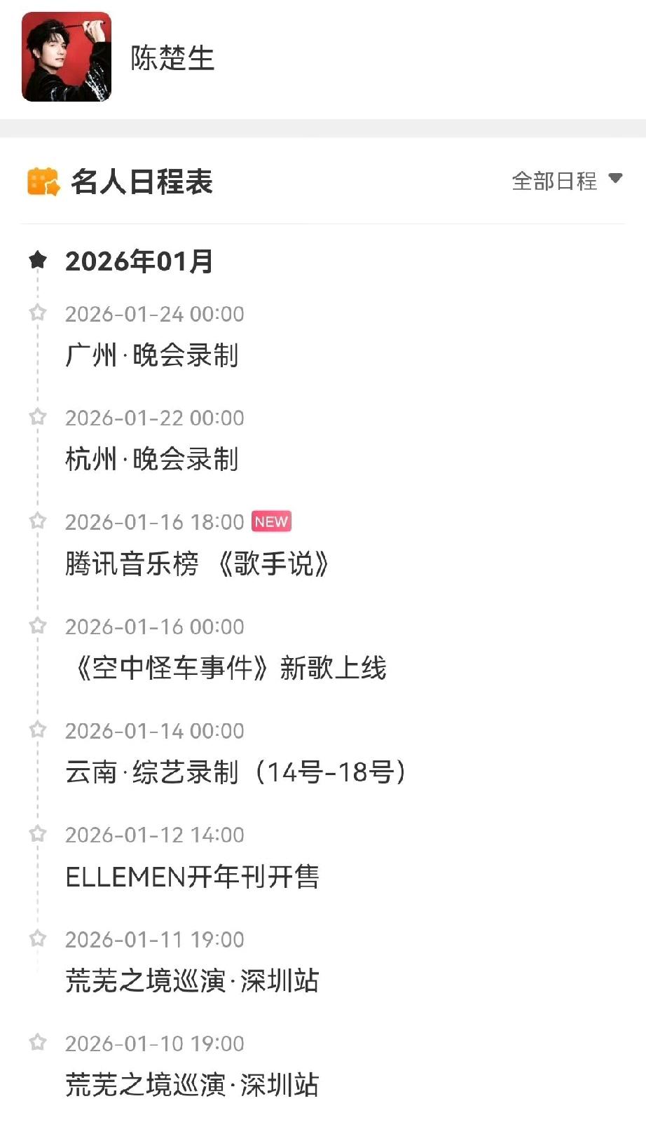 陈楚生一月份的行程表,看了很不开心。 按这份行程表看,他即将参加两个春晚的录制,浙江和广东卫视。 广东卫视的录制时间是1.24号,可是春晚第二次联排的时间是1.25号,第一次联排他在录快乐老友记,情有可缘,如果第二次联排他还没有出现,那么就是彻底无望了。 现在这个行程单,看的人心沉沉的。 或许他真的没有执念了,大年三十在家陪父母陪家人也挺好的,这一年这么辛苦,可是我有,我有执念啊! 我不相信春晚看不到他,明明今年被那么多主流官方媒体看到并夸赞过,也明明《将近酒》那么贴合马年春晚的主题,为什么春晚会没有他? 到底差哪儿了[可怜]?陈楚生 春晚