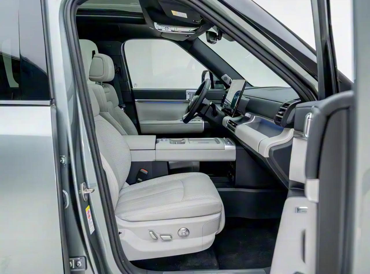 2025款方程豹钛7外观实拍观察 2025款方程豹钛7采用方盒子造型,尺寸4999×1995×1865mm,轴距2920mm,线条以直线直角为主,体量感突出。 前脸为封闭式格栅+亮黑饰板,中央可点亮品牌标识,搭配双层L形灯带与方形头灯,前包围“H”型银饰件形成色彩对比。 侧面车顶与水切线平行,A柱至D柱黑化+悬浮式车顶,外凸轮拱、多辐轮毂、隐藏式门把手,线条简洁。 车尾纵向尾灯呼应前脸,黑饰条拉宽视觉,侧开尾门配32.5L外挂储物盒,后包围银护板与前呼应。 漆面有山水绿、旭日金等7种高闪珠光配色,支持渐变改色,装配规整。外部配电动侧踏、车顶行李架、外后视镜电调加热,部分版本带后视镜摄像头。 (图片来源:汽车之家)