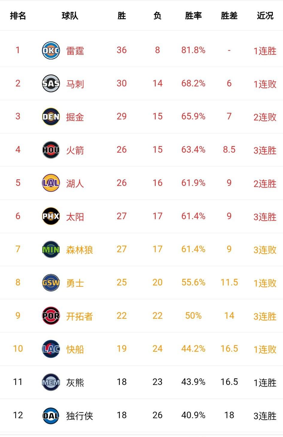 西部又是混乱的一天,谁能想到不是湖人,也不是火箭,居然是森林狼先掉入附加赛区。 马刺掘金分别输给火箭湖人,排名仍然分居第二第三。 快船输球终结7连胜,排名仍然第10。 巴特勒赛季报销,勇士的心态也该变了,本赛季能冲进附加赛就成功了。今天输给猛龙很正常。 火箭逆转马刺、湖人逆转掘金、太阳险胜76人、森林狼不敌爵士,它们分居第4-第7。