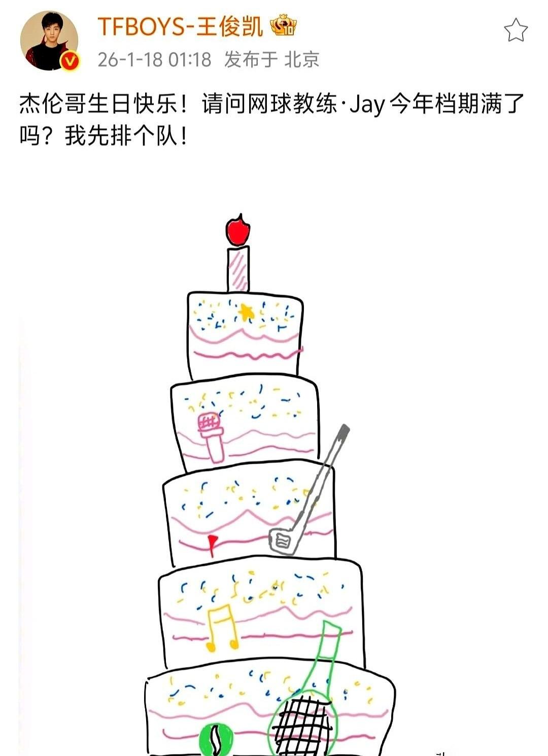 每年到今天,看到这事儿,都得恍惚一下。 第十一年了。 一个顶流,给另一个天王,亲手画个生日蛋糕。 这事儿魔幻在哪? 魔幻在,那个画蛋糕的小孩,从15岁画到了26岁。 他人生最叛逆、最动荡、最容易“移情别恋”的十年,就这么一年一年地坚持下来了。 当年那个把偶像名字写在课桌上,听着mp3热血沸腾的小孩,如今自己也成了别人的光。 可他还是那个小粉丝。 还是用那种最笨拙、也最真诚的方式,向曾经照亮过自己的那个人,递上一份不变的心意。 说白了,这已经不是“追星”了。 在这个流量为王、人设真假难辨的时代,这种坚持像个异类。 它告诉你,有些喜欢,是真的可以不求回报、不掺杂质,纯粹到只剩下敬意和感谢。 这更像一个仪式。 一个长大了的孩子,在每年固定的时间,回头看看来时的路,对自己的青春,也对那个陪他走过青春的人,轻轻说一句: “嘿,你还在,真好。你看,我也还在。”