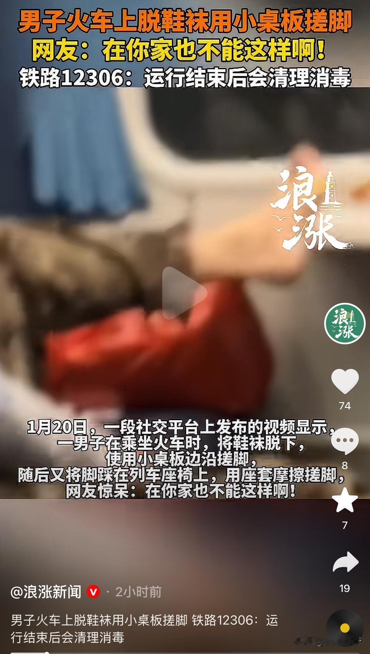 太恶心了!近日,有网友爆料,在火车上有一男子脱掉鞋袜,把脚伸到小桌板上,来回摩擦搓脚,随后又踩在列车座椅上,用座椅套摩擦搓脚。 紧接着,12306对此回应,每趟车结束的时候,都会清理消毒,肯定要对旅客负责,把卫生搞干净。 该男子在公众场合做此等行为,真是既没素质又不讲卫生,火车上的小桌板是大家吃饭,或者趴着休息的地方,他用来搓脚,想想都觉得恶心。 而且不是每个人坐火车,都是从起点坐到终点,万一他中途下车了,列车工作人员没有消毒,其他乘客被传染了病毒,谁来负责? 所以建议大家出门在外,一定多准备点消毒用品。 而且我认为,对这类人一定要有规则条款约束,必须有惩罚性措施才行,如果只是道德谴责,对他来说无关痛痒。 大家说,对吗?