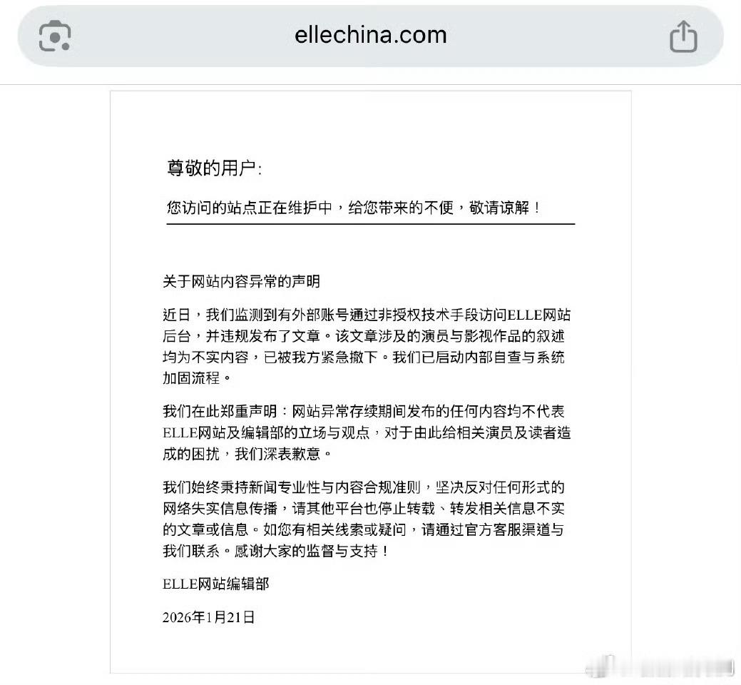 ELLE 影视创作须回归本源啊,ELLE发布声明说有外部账号黑了他们,违规访问后台并发布了文章……