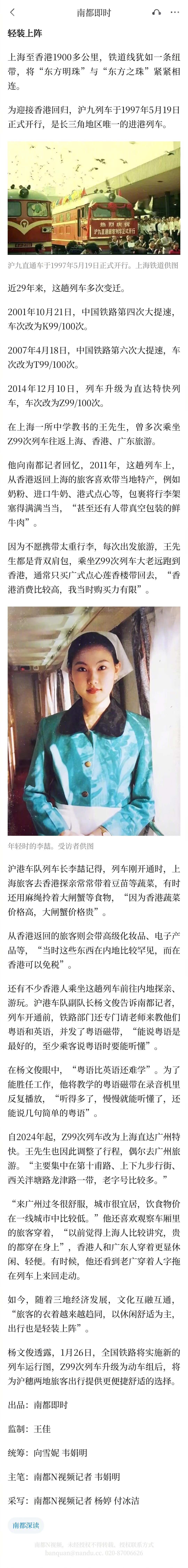 #Z99次沪九直通车的时代记忆#【从广交会到世博会:Z99次沪九直通车联通南北的时代记忆】#开行29年Z99次沪九直通车停运#16年前,广州仔小蔡跟随父母北上打卡上海世博会;13年来,从事外贸的许先生坚持南下广州参加广交会,两个陌生人对于Z99次沪九直通车有着相同的回忆。苏州的严先生很喜欢“Z99”的谐音梗——“直达久久”。当女友顺利拿到华为的offer后,他选择支持她追逐梦想。“有句老话,‘东西南北中,发财到广东’。”异地恋的日子里,他是这趟车的常客,如今两人已结为夫妻。沪港车队列车长李喆记得,列车刚开通时,从香港返回的旅客会带高级化妆品、电子产品,“当时这些东西在内地比较罕见”。来自上海的Z99次列车旅客王先生发现,近几年,随着三地互融互通,人们更偏向轻装上阵了。1月12日17时19分,伴随一声悠长的火车鸣笛声,最后一班Z99次列车从上海站缓缓启动,驶向广州白云站。这趟曾经往返沪九、后来穿梭于沪穗的列车,结束了二十九载联通南北的使命。广交会、异地恋、手信……南都N视频记者多方对话,记录Z99次列车里的时代记忆。
