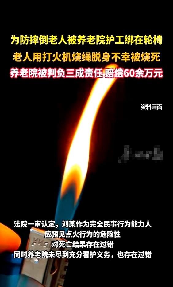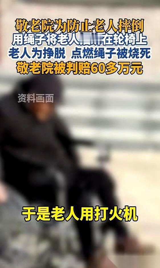 用绳子,把一个60岁的大爷绑在轮椅上。 就这一句话,听着是不是就有点不对劲了? 更让人喘不过气的还在后面——大爷为了挣脱,掏出个打火机,想烧断绳子,结果,火点着了自己,人没了。 真的,我看到这事儿的时候,后背全是凉的。 都说护工“没办法”,说大爷半夜三更大喊大叫要起床,一个人管不过来,怕他摔了。 “没办法”。 我反复琢磨这三个字,怎么听怎么刺耳。是真没办法,还是图省事儿的“没办法”? 一个行动不便的老人,得有多绝望,才会选择用火这种方式来换取自由?那瞬间,在他眼里,那根绳子,可能比火还可怕吧。 他只是想站起来,只是想动一动,就这么简单。 我们总说要给老人尊严,可尊严是什么?尊严不是吃好喝好,是“我”还是“我”,一个活生生的人,不是一个需要被捆起来的“麻烦”。 最后法院判了,敬老院赔60万,担责30%。 剩下70%,怪大爷自己点火? 是,火是他点的。 可把他逼到那个份上,让他觉得除了点火别无选择的,又是什么? 这根绳子,绑住的是一个老人,拷问的,是我们所有人。 我们都会老,都会有需要人照顾的那一天。 我只希望,到那天,我们面对的,不是一根冰冷的、叫作“没办法”的绳子。