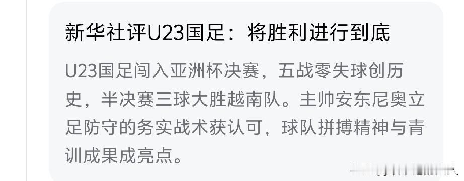 一战成名啊!😎 现在中国足球是人见人爱,官媒先后发生,人民日报和新华社都发文鼓励,鼓励队员将胜利进行到底。就连股市的足球概念今天都大涨特涨,说明资本也爱! 当然,最后一场决战对日本,即是生死战也是荣誉战,U23这帮小伙子必须要拿出百倍的信心和勇气,把精气神给踢出来。