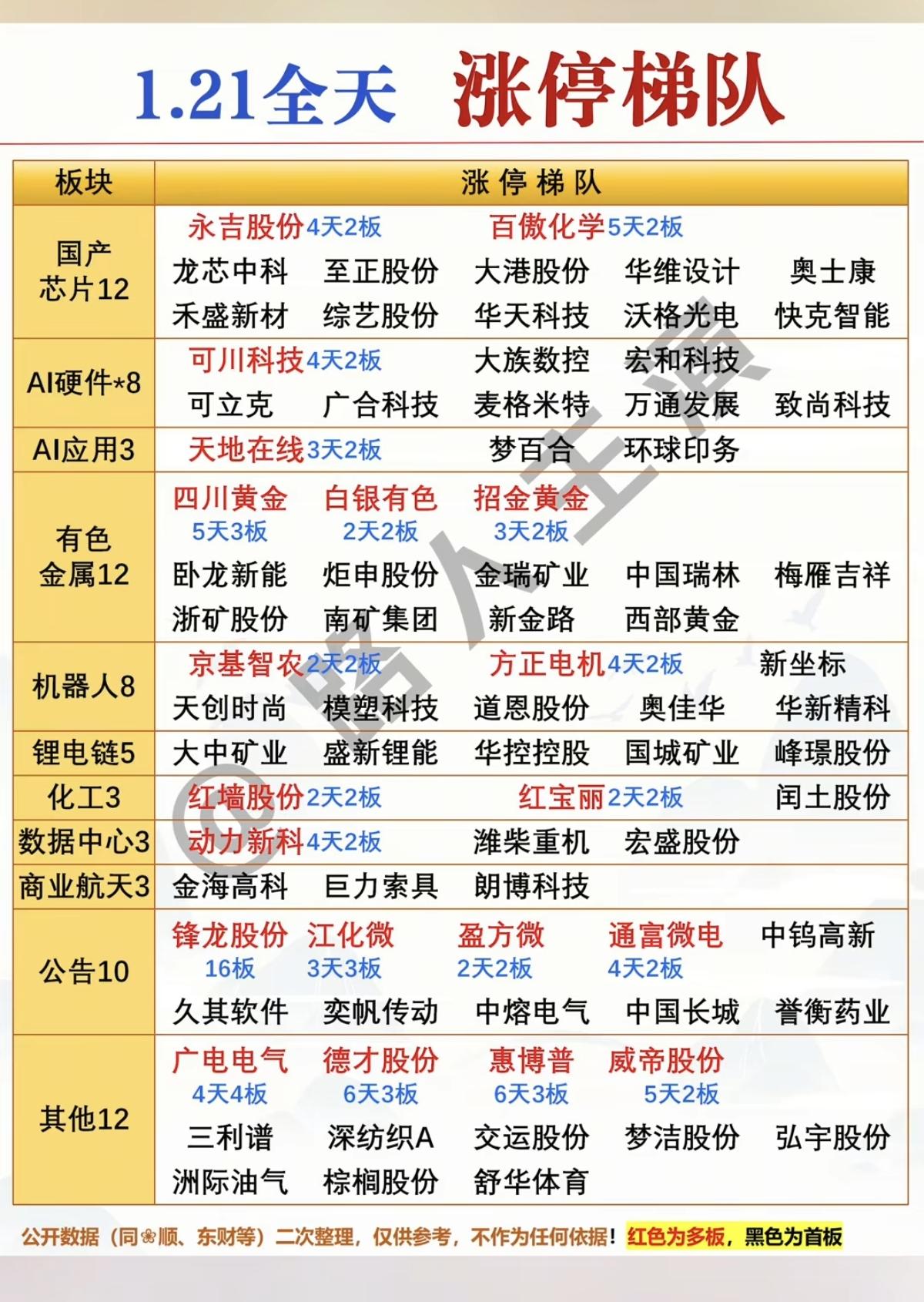1.21周三 涨停板股票:题材+高度! 机器人 锋龙股份16板 市场热点方向:先进封装+机器人+黄金 油气开采,通信设备,PCB钻针钻孔 芯片半导体 12股涨停 人工智能AI 11股涨停 有色金属 12股涨停 机器人 8股涨停