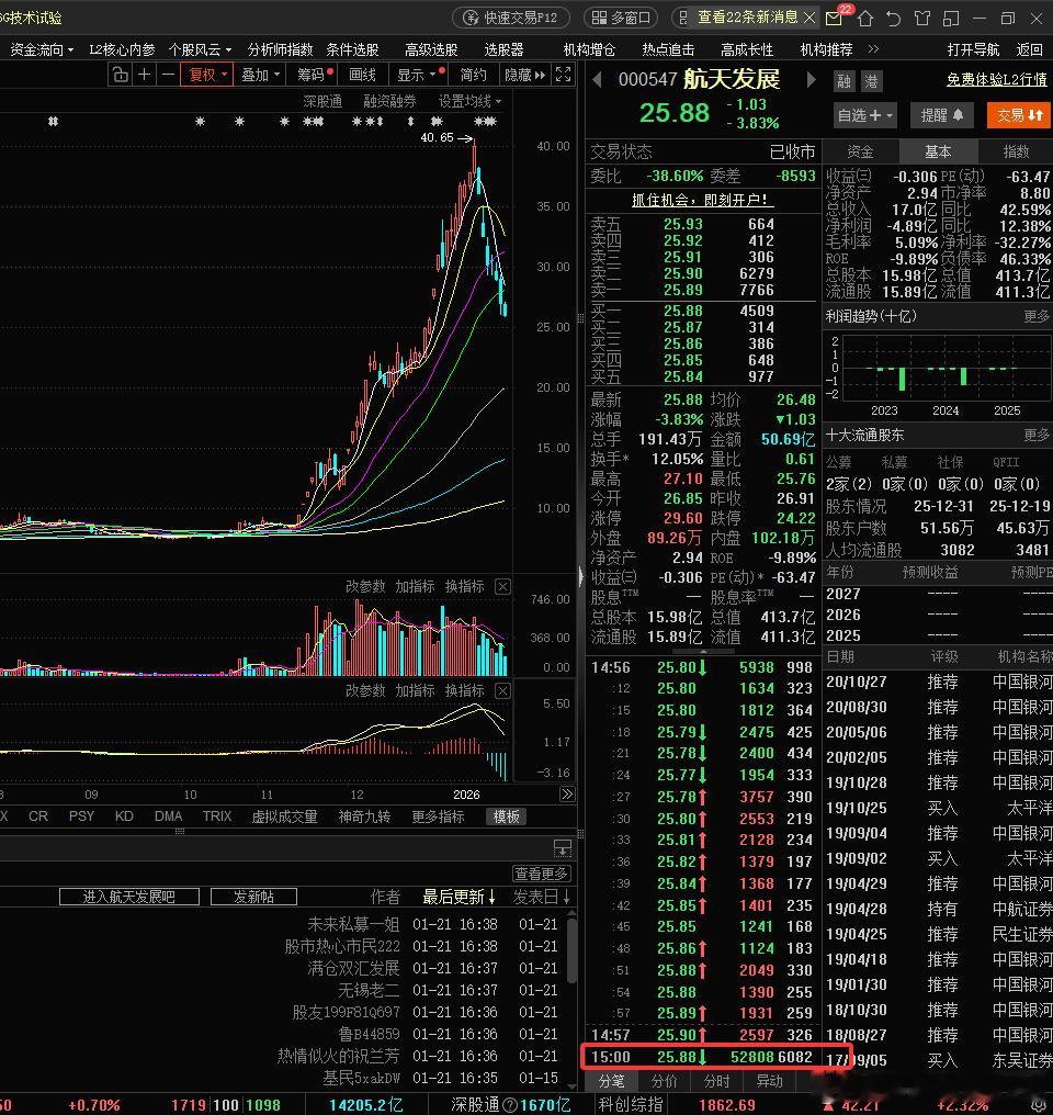航天发展 尾盘出现盘口语言 25.88元 成交52808手,搞不好要动了。财经股票