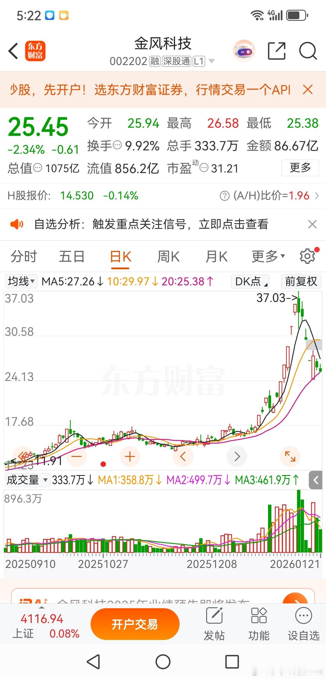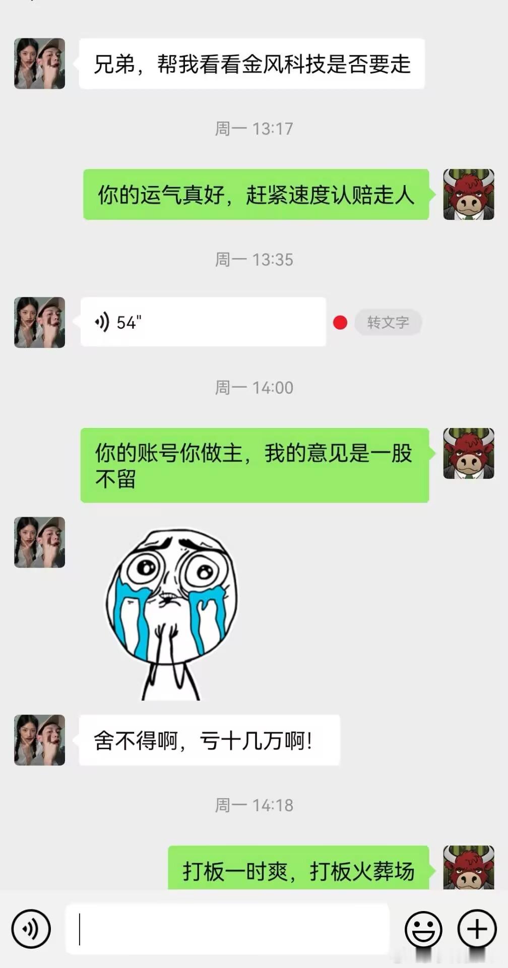 金风科技,有反弹要继续离场金风科技,这一波的妖股崩塌不可为不惨,三四个跌停的股票比比皆是,有人慌不择路的出逃,有人顶着风雪进场,具体对错还是要看具体的股票了。金风科技,这两周虽然走了翻倍的行情,但是他和许多妖股还是有很大区别的,这个票不是单纯的游资接力票,而是机构、游资、量化,共同参与的一个票。金风科技,虽然在高位出现了连续两天的巨量成交,但是由于这是一个市场多方力量参与的票,连续三个跌停还是埋掉了不少资金。1月19日金风科技的15cm的地天板,后面两天的走势已经是证伪了,大概率是主力资金自救的一种行为。一般而言,地天板在强势市场中是有可能走出溢价的,但是目前的市场情绪很显然是受到了重挫,愿意追高捧场的资金少之又少。所以19日那天有位群友问我是否要走,我的态度是坚决地,必须离场,不能赌第二天的溢价。当然,我也不能说在这里就不会再反弹了,因为妖股们近期普遍跌幅较大,随时也可能发生一次反弹,说不定还能带带金风科技,但是近期想再看到25.8元这样的高点很困难了。欢迎加入我们的免费交流群股票财经