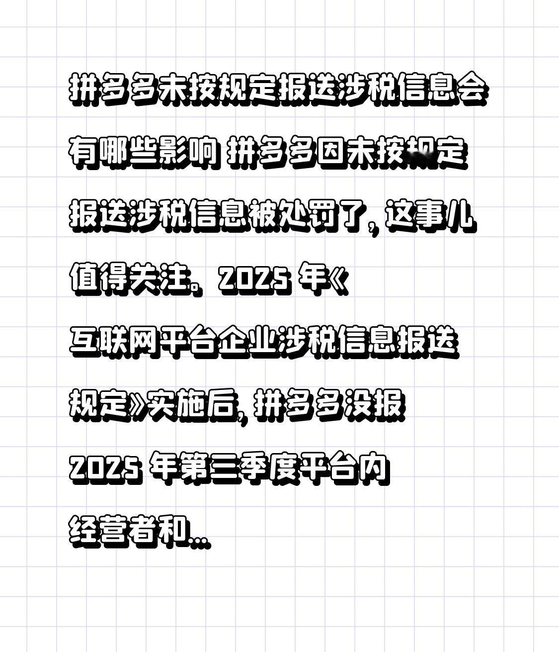 拼多多未按规定报送涉税信息会有哪些影响 拼多多因未按规定报送涉税信息被处罚了,这事儿值得关注。2025 年《互联网平台企业涉税信息报送规定》实施后,拼多多没报 2025 年第三季度平台内经营者和从业人员涉税信息。税务机关 2025 年 11 月责令其限期改正,它虽整改了但没在期限内完成,结果被上海长宁区税务局罚了 10 万元。 其实《电子商务法》也有相关规定,未报送信息,先责令改正,逾期不改,处 2 万 - 10 万元罚款,情节严重的还会责令停业整顿,并处 10 万 - 50 万元罚款。这说明不管多大的平台,都得依法依规经营,诚信纳税,不然就得付出代价。