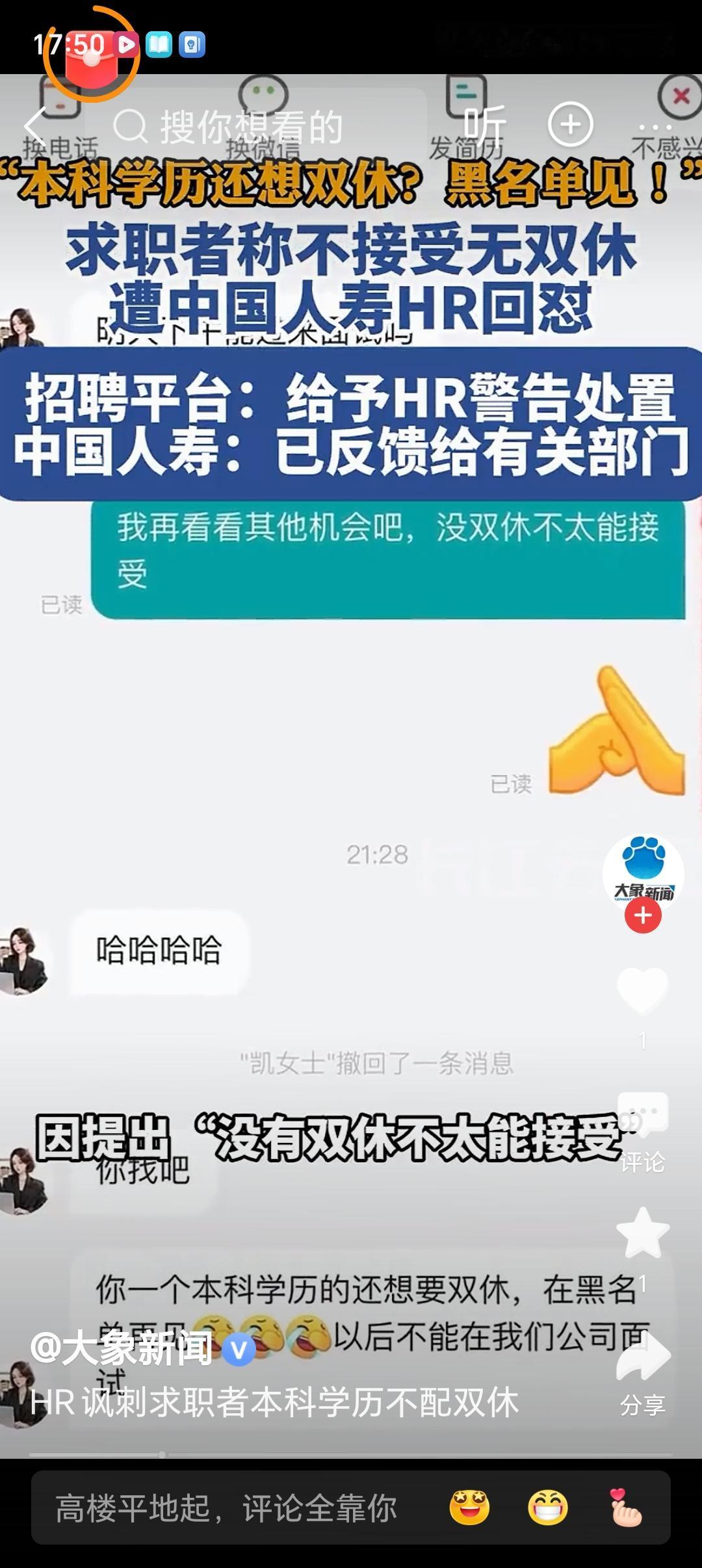 HR讽刺求职者本科学历不配双休 现在这招聘市场,真是啥事儿都有。有个 HR 居然讽刺求职者本科学历不配双休。真是让人惊掉下巴!本科学历怎么就不配双休了?现在本科毕业生一抓一大把,大家都努力学习才拿到这个学历。双休是合理的休息需求,跟学历高低有啥关系。这 HR 这么说话,只能说明公司格局小。要是一家公司连基本的尊重和合理的休息制度都保证不了,那就算入职了,估计也没啥发展前景。求职者碰到这种公司,还是趁早绕道走,别浪费自己的时间和精力。