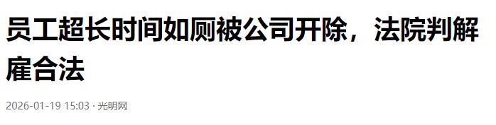 超出正常生理需求!江苏一男子找到一份1万月薪的工作,可老板却发现这人经常去卫生间。忍无可忍的公司最终“以擅自离岗”将其解雇,男子不服将公司诉至法院,法官看着公司的视频证据傻眼了:小伙上厕所最短31分钟,最长3小时5分钟,每天在上厕所时间最短1小时22分,最长6小时21分! 这回公司老板是真被折腾到忍无可忍了。 老板起初还以为是员工身体有隐疾,私下旁敲侧击提醒过几次,可对方要么含糊其辞,要么嘴上答应改正,实际行为半点没变。 无奈之下,公司只能依据内部规章制度,以“擅自离岗构成严重旷工”为由解除了劳动合同,没成想却被男子告上法庭,索赔二十余万元。 这起发生在江苏南通的劳动纠纷,可不是凭空杜撰的闹剧,而是南通市通州区人民法院审理的真实案件。 庭审中,男子辩解自己长时间滞留卫生间,要么是生理需求,要么是履行5S专员的巡检职责,并非故意旷工。 可法院调取的监控视频不会说谎,2023年2月短短二十几天里,他累计11次长时间占用卫生间,不仅时长远超常人生理极限,更没有任何工作日志能证明这些时间是在履职。 公司的《违规违纪行为处理制度》早已明确,未经允许离岗两小时以上视为旷工一天,月度累计旷工三日以上即可解除合同,这套制度不仅发布在公司内部网站,还作为劳动合同附件让男子签字确认,程序合法合规。最终法院认定,男子行为已构成严重违纪,公司解雇合法,驳回了他的索赔请求。 无独有偶,江苏苏州也曾审理过一起几乎一模一样的案件。当地一名工程师李某,一个月内累计14次在卫生间停留超一小时,单次最长接近4小时,公司多次联系不上人,核实情况后依法将其解雇。 李某同样不服,称自己是因痔疮发作需要护理,还提交了购药和手术记录作为证据,要求公司支付32万余元赔偿金。可法院审理后发现,他的购药行为发生在滞留卫生间后期,手术更是在被解雇之后,事发期间既没向公司说明病情,也没按规定申请病假,完全不符合请假流程。 更值得注意的是,李某在2024年4月前和5月27日后,都没有出现过长时间如厕的情况,这也从侧面佐证了他的行为与病情无必然关联。 其实这两起案件的核心争议点很明确:上厕所是人之常情,可超出合理范围的长时间滞留,到底算合法生理需求,还是违纪旷工?在很多人看来,上班时间偶尔多待几分钟卫生间,是无关紧要的小事,可法律和职场规则里,从来都讲究“合理边界”。 陕西丰瑞律师事务所的律师就明确表示,判断这类行为是否合规,不能一刀切,要综合看三个维度:时长是否符合常理、是否提前报备、是否影响工作运转。 像普通人上厕所,几分钟到十几分钟都算合理,可一旦单次超过一小时、月度多次出现,就打破了合理性基础;如果岗位要求实时在岗响应,哪怕离岗十几分钟,没报备也没保持通讯畅通,都可能被认定为脱岗,反之若提前说明、不影响工作,即便时间稍长也未必算违纪。 有人可能会替这类员工叫屈,万一真的身体不适,难道只能硬扛着上班?这里要明确一点,法律绝对保护劳动者的健康权,可健康不能成为擅自离岗的“免罚金牌”。 我国劳动法规定了劳动者的病假权利,只要按公司制度履行请假手续,提供病历、诊断证明等材料,就能依法享受带薪病假。 苏州的李某即便真有痔疮困扰,完全可以向公司申请病假安心治疗,可他偏偏选择隐瞒情况,用“泡卫生间”的方式消极怠工,这就从“合理维权”变成了“违规违纪”。 反过来,用人单位也不能过度管控员工的正常生理需求,比如有些公司给厕所装计时器、限制如厕时长,这种极端管理方式也可能触及法律红线,毕竟使用卫生间是劳动者的基本权利,用人单位有义务保障。 这两起案件最终的处理结果,也体现了法律对劳资双方的平衡。南通案件中男子败诉,苏州案件经二审调解,公司向李某支付3万元补助后双方和解,既没有纵容员工的违规行为,也考虑到了员工在职期间的贡献和离职后的实际困难。 说到底,职场关系的核心是“互相尊重、依规行事”,对劳动者而言,诚信履职是底线,身体不适就走正规请假流程,别心存侥幸搞“带薪摸鱼”,否则最后可能得不偿失。 对用人单位来说,规章制度要合法合规、公示到位,执行管理时也要兼顾人文关怀,不能一罚了之,给员工解释和申辩的机会,这样才能减少纠纷,实现双赢。 职场里没有绝对的自由,也没有无限的包容,合理的边界感才是保护双方权益的关键。别让一次心存侥幸的“摸鱼”,毁掉自己的职业信誉,也别让过度严苛的管理,寒了员工的心。 信息来源: 光明网:《员工超长时间“带薪如厕”被开除,如何界定离岗摸鱼行为?》(2026年1月19日)