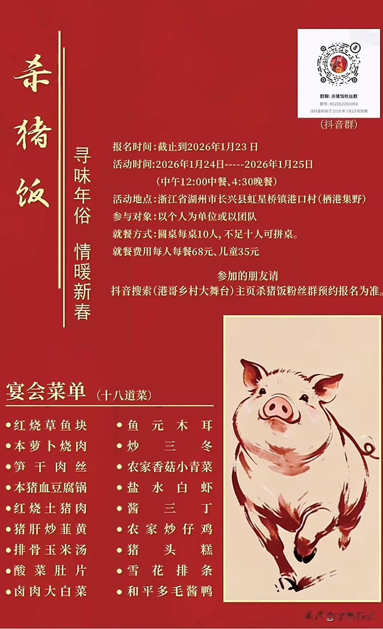 继各地相继举办免费杀猪宴之后,浙江长兴县率先推出收费杀猪宴。 为助力当地农户销售本地土猪肉和农家菜,长兴县虹星桥镇港口村的村支书想出了办收费杀猪宴这个办法。 据悉,杀猪宴每桌有18道菜,每桌坐满10人便开席,大人每人收费68元,小孩每人收费35元。 目前,这个活动正在火热报名中,杀猪宴时间为1月24日至25日。 朋友们,要是你们,会选择参加这种收费的杀猪宴吗?欢迎在评论区交流。 (图片来源网络)