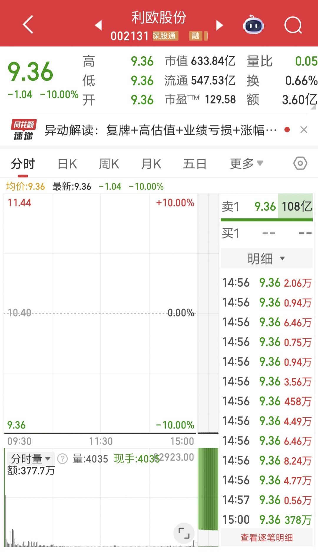 一秒跌停! 今天利欧股份放出来后一字跌停补跌。 但是这百亿级别的封单,真是太夸张了。 停牌前一天成交额253.4亿,统统被埋,不知道明天能不能放人走。 游资