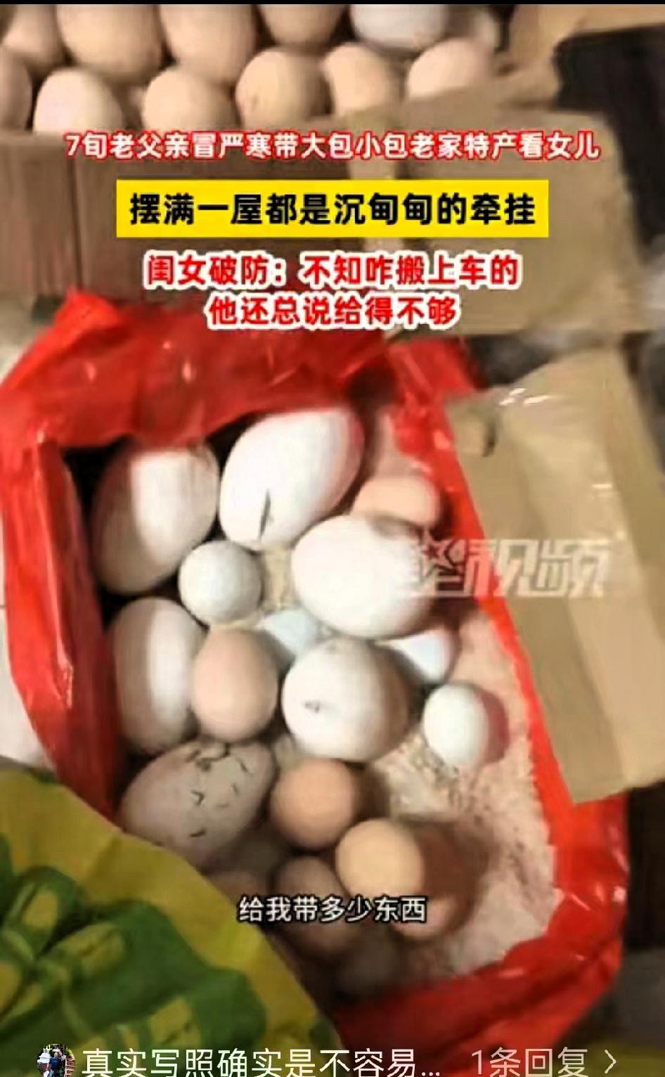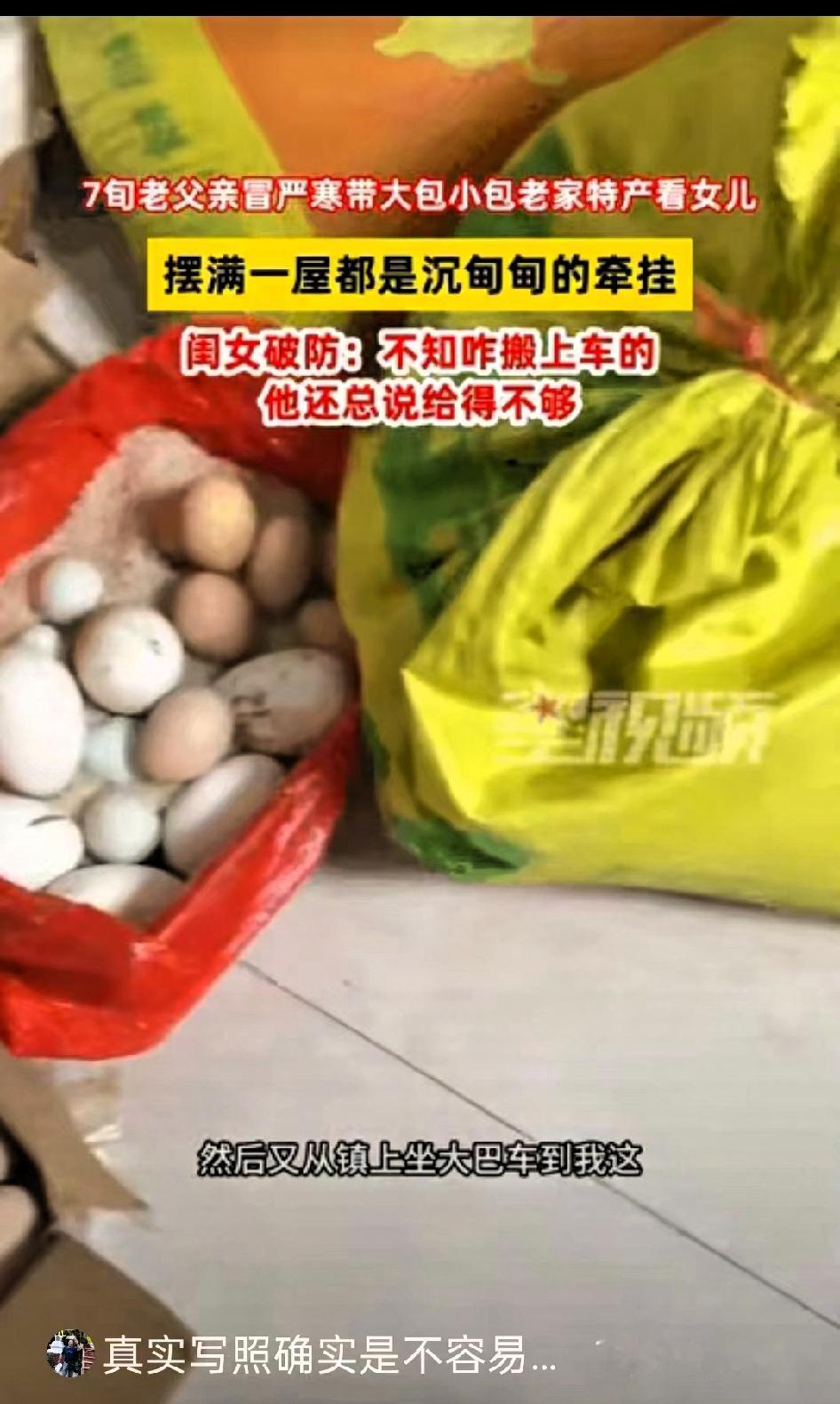 泪目了!河南郑州,近日,一位75岁老父亲在零下10度的天气,竟然从农村坐大巴250多公里给女儿送土产。 女儿毛女士一开始还劝他,天冷路滑,自己年纪大了出门不安全,说过两天就带着孩子开车回乡下看他。可老父亲早有准备,不仅收拾好了东西,还请人帮忙买好了车票,一句“都弄好了,不用折腾你们”,让女儿心里又暖又涩。 等到丈夫把父亲接回家,打开后备厢的那一刻,毛女士瞬间红了眼眶。她原本以为,不过是些父亲自种的青菜,没想到里面满满当当全是心意:水灵的青菜、新鲜猪肉、两只土鸡、自家榨的香油,还有整整200个土鸡蛋。 谁都能想到,一位古稀老人,拎着这些沉甸甸的物件挤在摇摇晃晃的大巴上,一路上得有多小心,才能护住这200个鸡蛋不被磕碰。这哪是普通的土产,分明是父亲生怕女儿吃不到家里味道的惦记。 我们常说父爱如山,这份爱从不是华丽的言辞,而是藏在这些朴实的吃食里,藏在顶风冒雪的奔波里,藏在“我想你”却只说“给你带点吃的”的笨拙里。比起商场里的昂贵礼品,这一后备厢的东西才更珍贵,因为里面装着的是最纯粹的牵挂。 零下10度的风再冷,也抵不过这份亲情的温度。这就是中国式父母的爱,朴素无华,却足够温暖我们往后的岁岁年年。