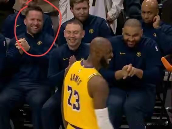 还有一个老熟人! 今天对阵掘金,詹姆斯与杜德利的互动引发热议。其实除了杜德利外,掘金队替补席还有一个熟悉的面孔,那就是当年小牛队的巴里亚,目前也在掘金队助理教练组工作,与詹姆斯也算是老对手了。当詹姆斯与杜德利“友好”互动时,旁边的阿德尔曼和巴里亚也被逗得哈哈大笑,这一幕别有一番记忆的风味。
