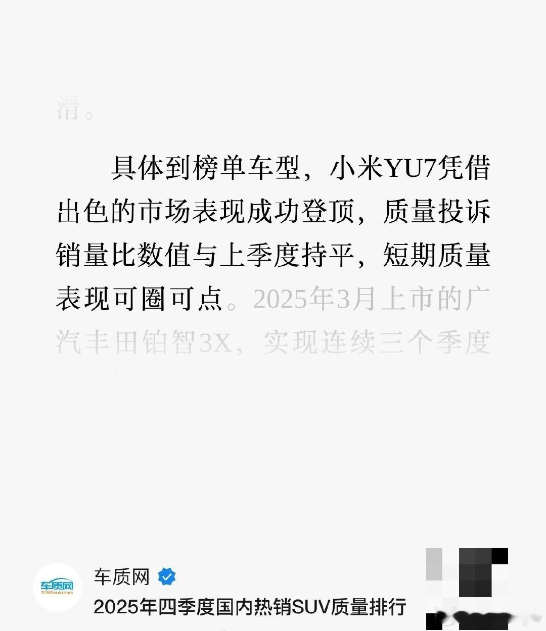 小米YU7这质量答卷直接封神车质网四季度SUV质量排名出炉,小米YU7直接拿下榜首🥇投诉销量比仅万分之0.9,狠狠甩开24.8的行业平均水平,358款车型里一骑绝尘的稳!自主品牌继续领跑市场,小米这波用硬质量说话,把新能源车型的品控天花板又拉高了~选车看品控的,这波闭眼冲不亏✨小米YU7获得SUV质量排名第一小米汽车新能源SUV小米汽车大v聊车